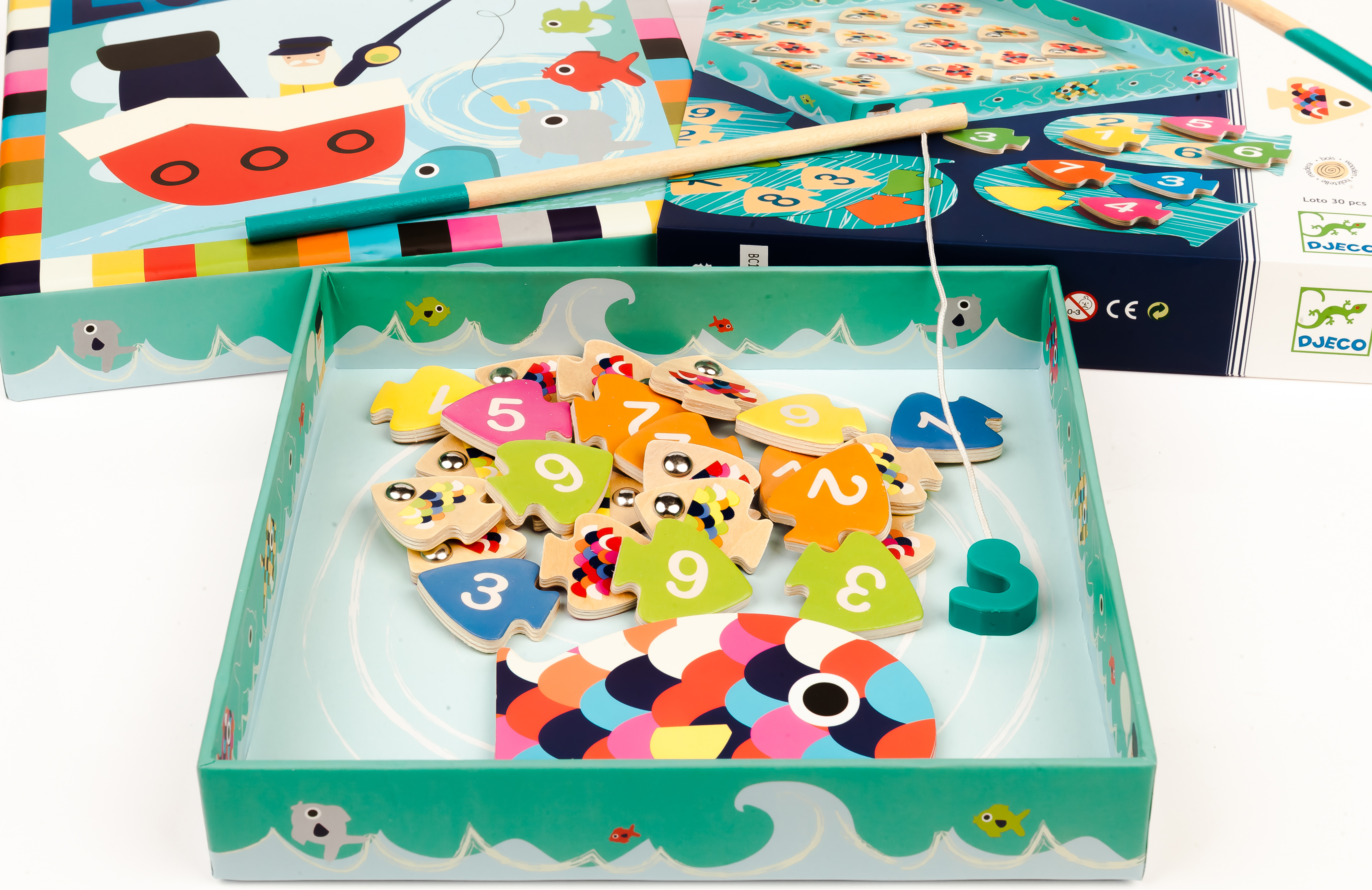 Навчальна гра-лото від Djeco, в якій гравці ловлять свою пронумеровану рибу за допомогою магнітної вудки, щоб заповнити свою дошку рибою правильного кольору. Той, хто першим набере свою дошку, стає переможцем!