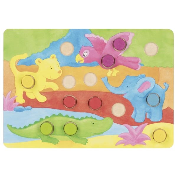 Дерев’яна настільна гра лото «Різнокольоровий світ II» від німецького бренду якісних дитячих іграшок goki. До комплекту гри входить: 4 ігрових дошки, 90 різнокольорових циліндрів та гральний кубик. Всі деталі виготовлені із натурального дерева, вкритого різнокольоровими фарбами на водній основі. Мета гри – якнайшвидше закрити отвори свого ігрового поля відповідним кольором циліндрів. Матеріали, що входять у комплект лото, виготовляються виключно з натуральної сировини і є абсолютно безпечними для дітей. Розмір: 20.5 x 14.5 см