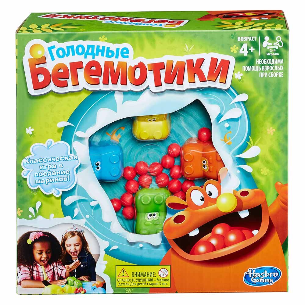 У грі Голодні бегемотики від Hasbro Games учасникам доведеться позмагатися один з одним у вправності на предмет поїдання різнокольорових кульок, які так люблять іграшкові голодні бегемотики! У кожної фігурки є важіль, натиснувши на який, бегемотик з'їсть кульку. Переможцем у грі стане той, хто набере більше м'ячиків.