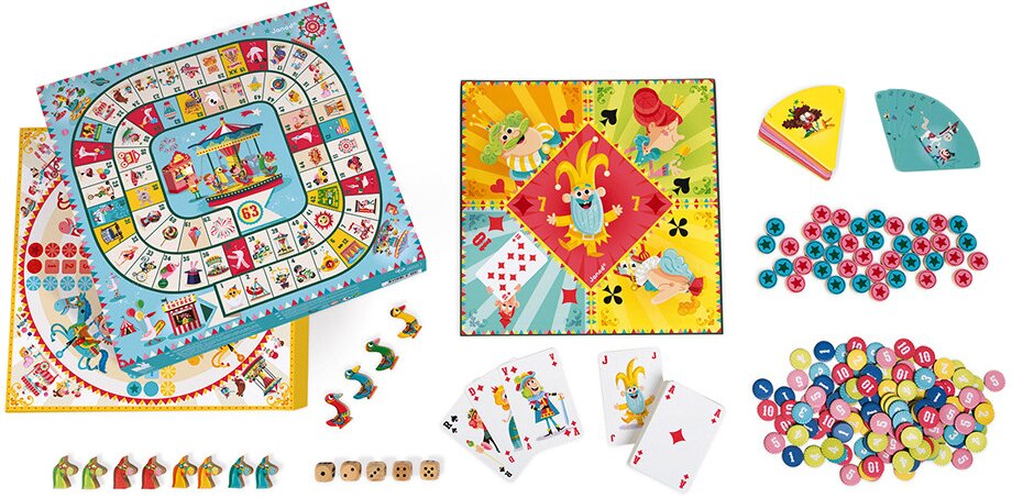 Настільна гра 5 в 1 від французького бренда Janod. П'ять різних захопливих ігор, завдяки яким можна весело провести час усією родиною. Кількість учасників у будь-якій грі від 2 до 6.