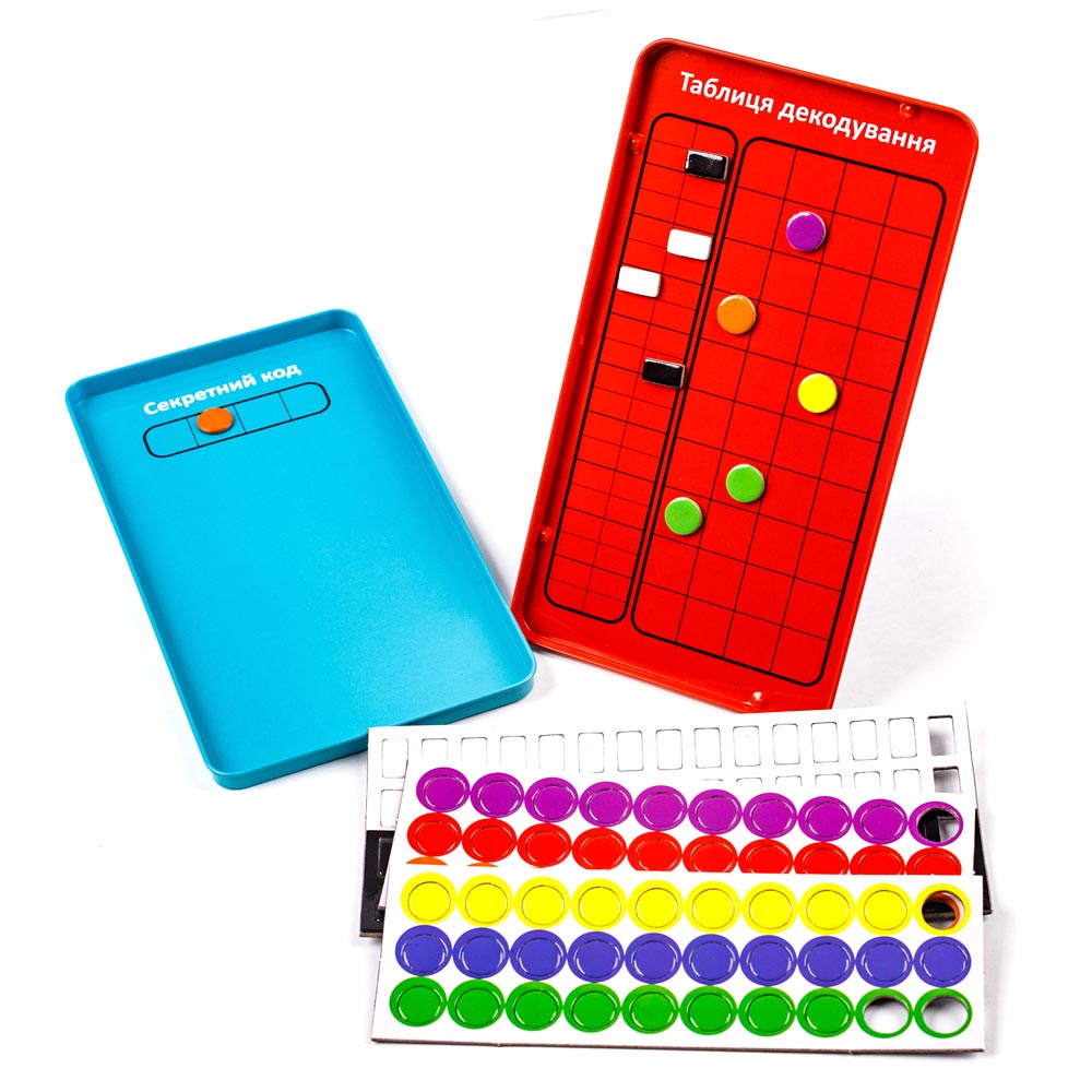 Настільна гра JoyBand Секретний код — стратегічна гра, яка чудово підходить для подорожей та сподобається всій родині. Правила: Задача гравця-дешифрувальника відгадати як розташовуються кольори на дошці шифрувальника за мінімальну кількість ходів.