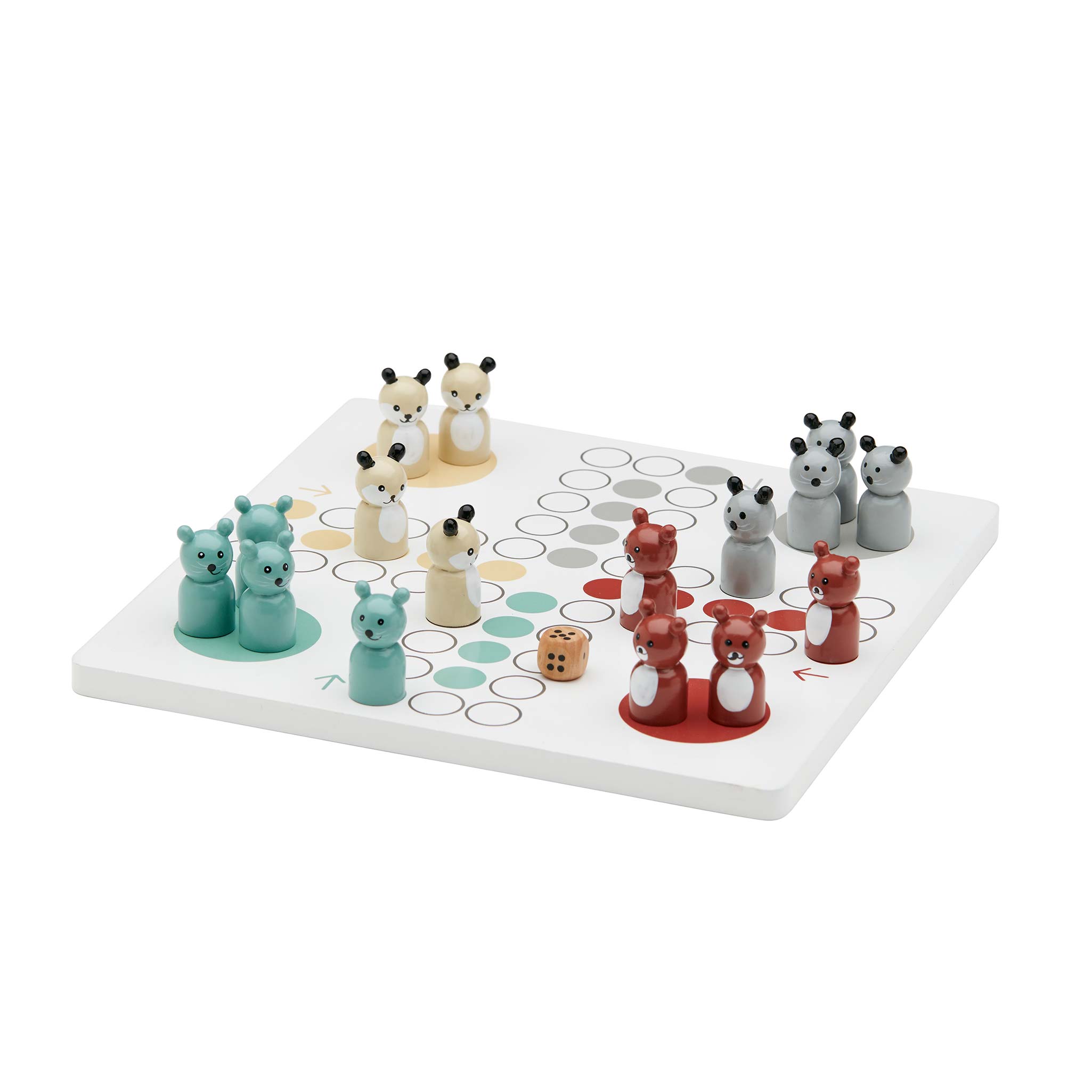 Симпатична дерев'яна настільна гра "Лудо" виконана у м'яких тонах. Виберіть одну з чотирьох фігурок тварин із концепції Kid's Concept EDVIN, натхненної шведськими лісовими тваринами.