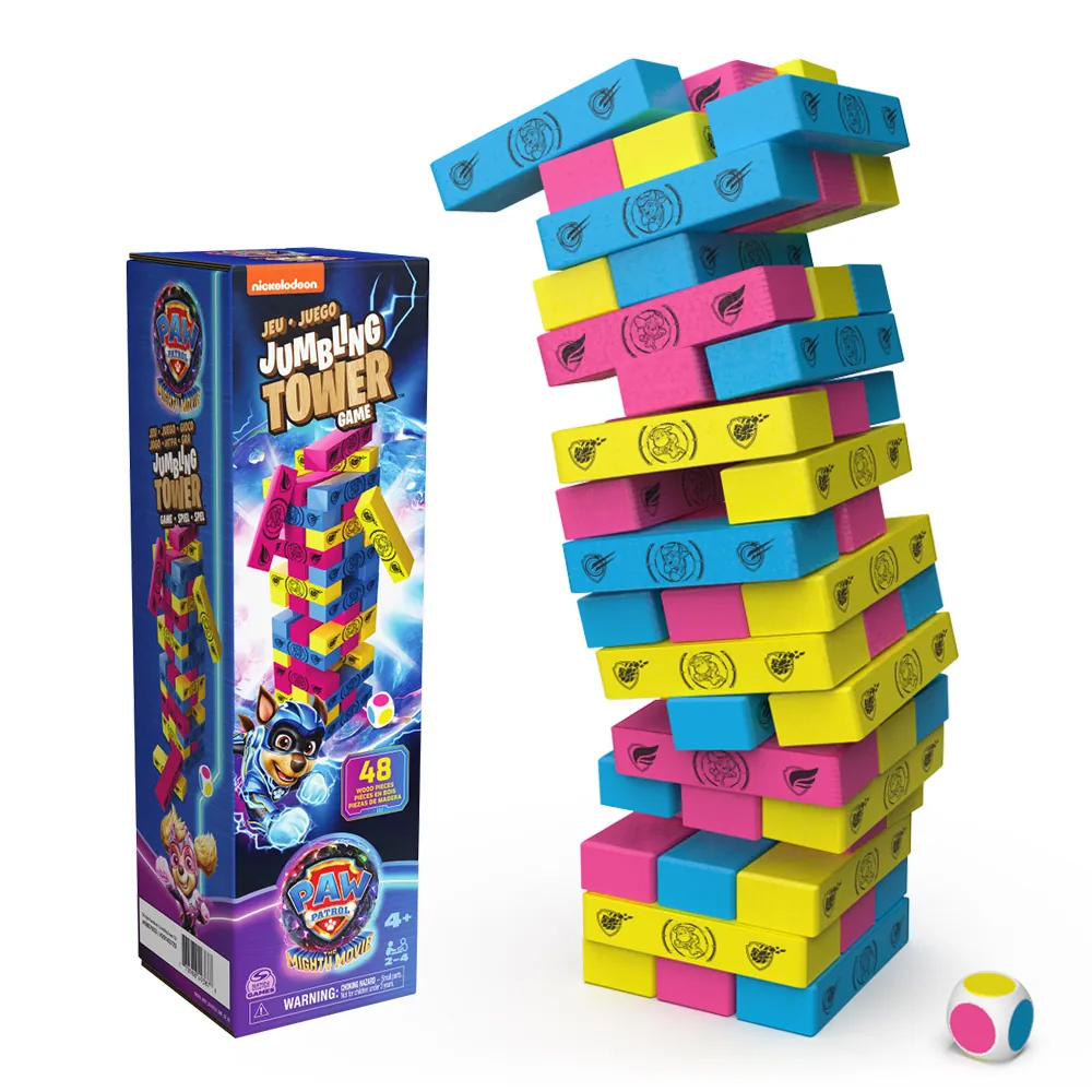 До складу входять 48 рожевих, жовтих і синіх дерев’яних блоків зі зображеннями персонажів «Щенячий патруль. Мегакіно». Киньте кубик, щоб визначити, блок якого кольору потрібно дістати з вежі та покласти зверху. Продовжуйте по черзі кидати кубик і робити по одному переміщенню, доки вежа не впаде.