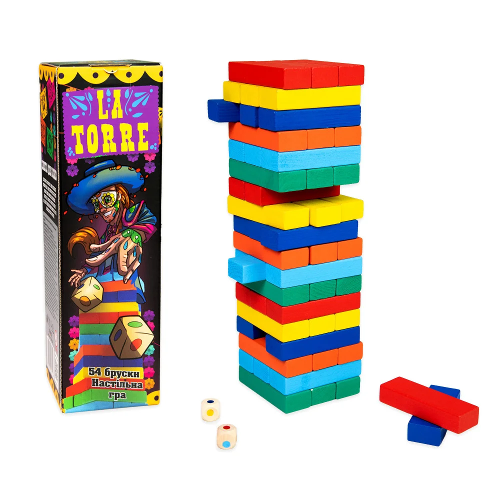 «La Torre» – улюблена і давно відома Дженга, що урізноманітнить вільний час будь-якої компанії, і що не менш важливо будь-якого віку. Принцип гри простий і зрозумілий: тягни брусок, викладай його на вершину вежі. Переможцем стане той, чий хід був останнім перед падінням вежі!