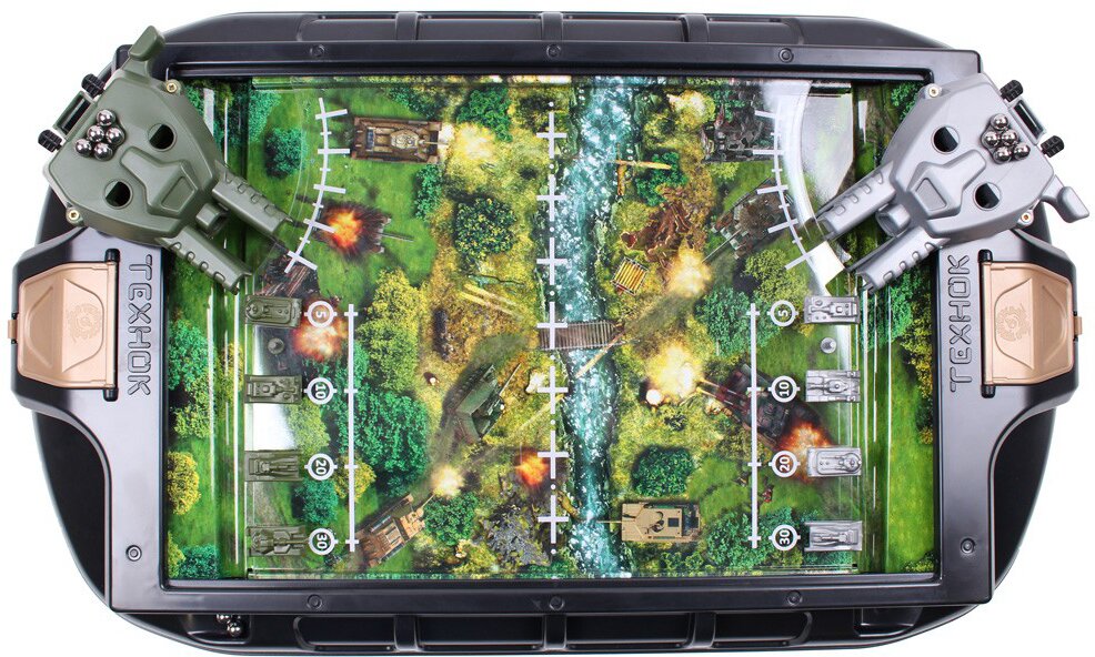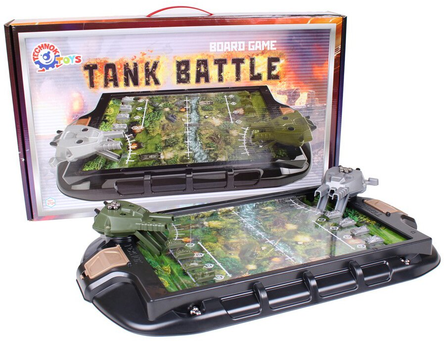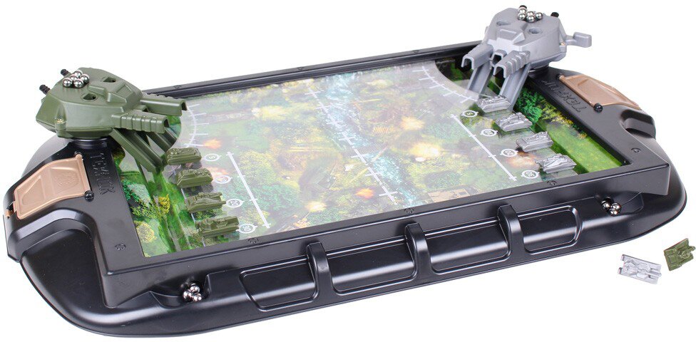 Іграшка Танкові баталії — захоплива та динамічна настільна гра з яскравим ігровим полем. У кожної сторони є велика гармата з металевими кульками-снарядами й 4 танки.