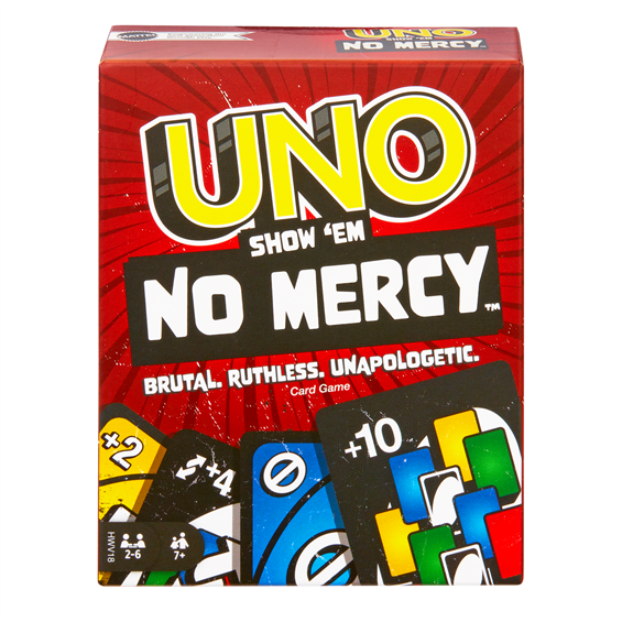 UNO «Без вибачень» – це наша найбезжальніша версія гри UNO! У ній на 56 карт більше. Суворіші картки дії (є охочі взяти 10 карт?) і нові правила, які змусять гравців складати, міняти місцями та брати більше карт, ніж будь-коли раніше! Більш жорсткі карти дій, такі як «Пропустити всіх», «Шалена карта «Візьми 6» і навіть «Шалена карта «Візьми 10», роблять гру безжальною!