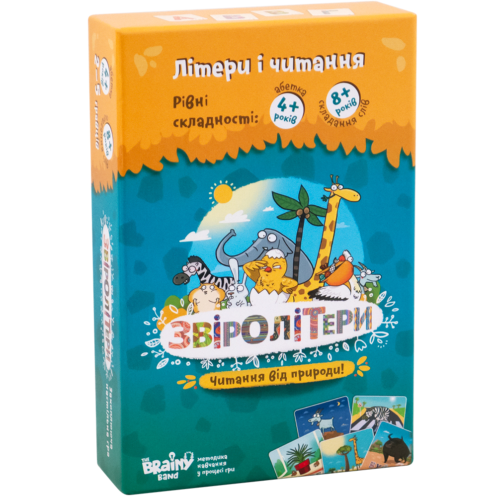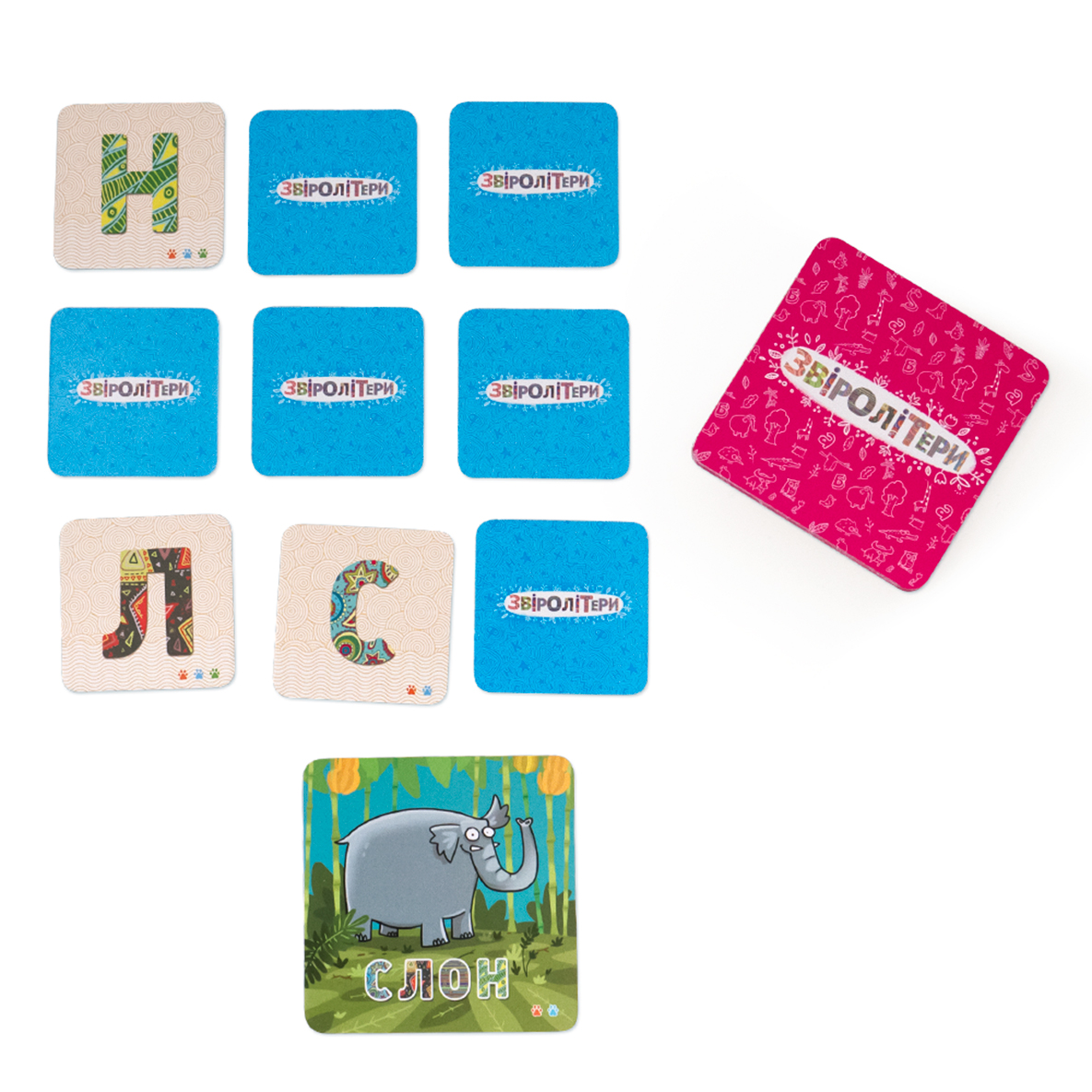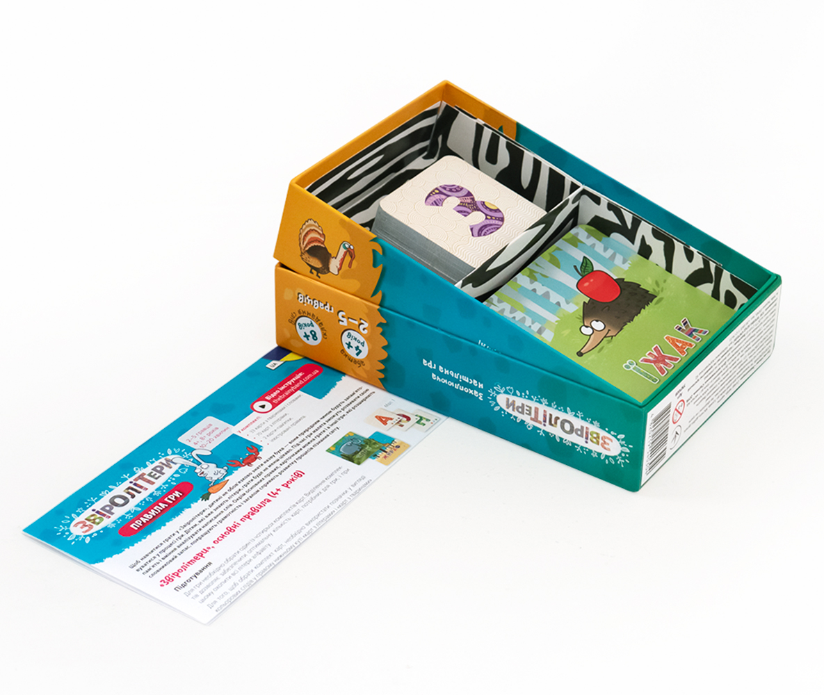 У коробці: 33 карти зі звірами, 70 карт з буквами, 1 карта-пам'ятка з алфавітом, ілюстровані правила.