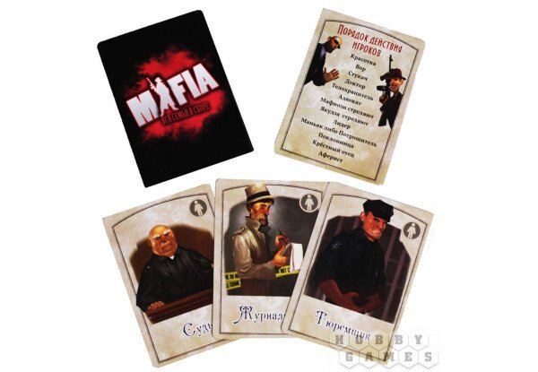 В наборі: 29 карт ролей: 5 лідерів мирних жителів, 5 особливих мирних жителів, 5 звичайних мирних жителів, 3 одиночки, 4 особливих мафіозі, 4 звичайних мафіозі, 3 якудзи, 20 карток для ведучого, правила гри.