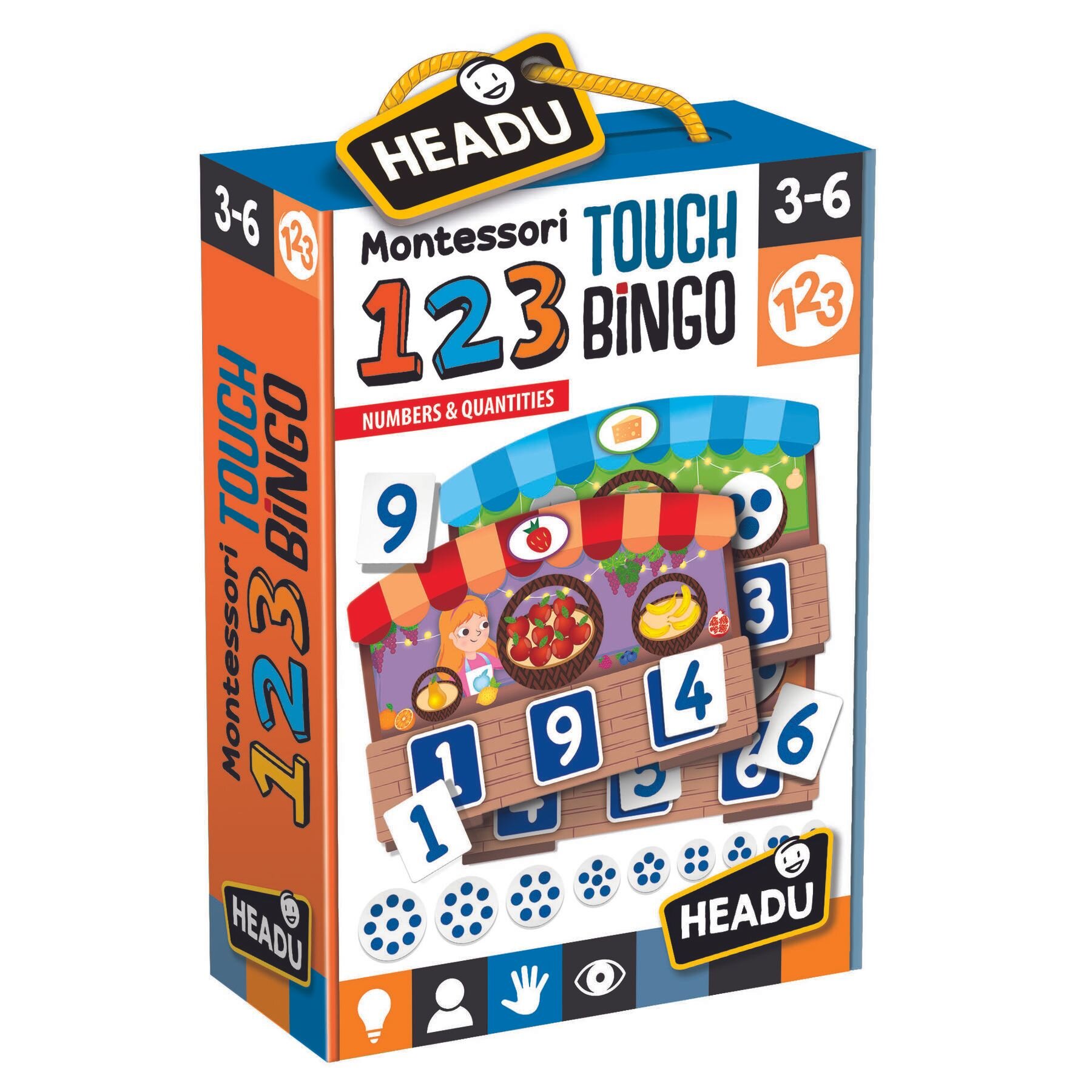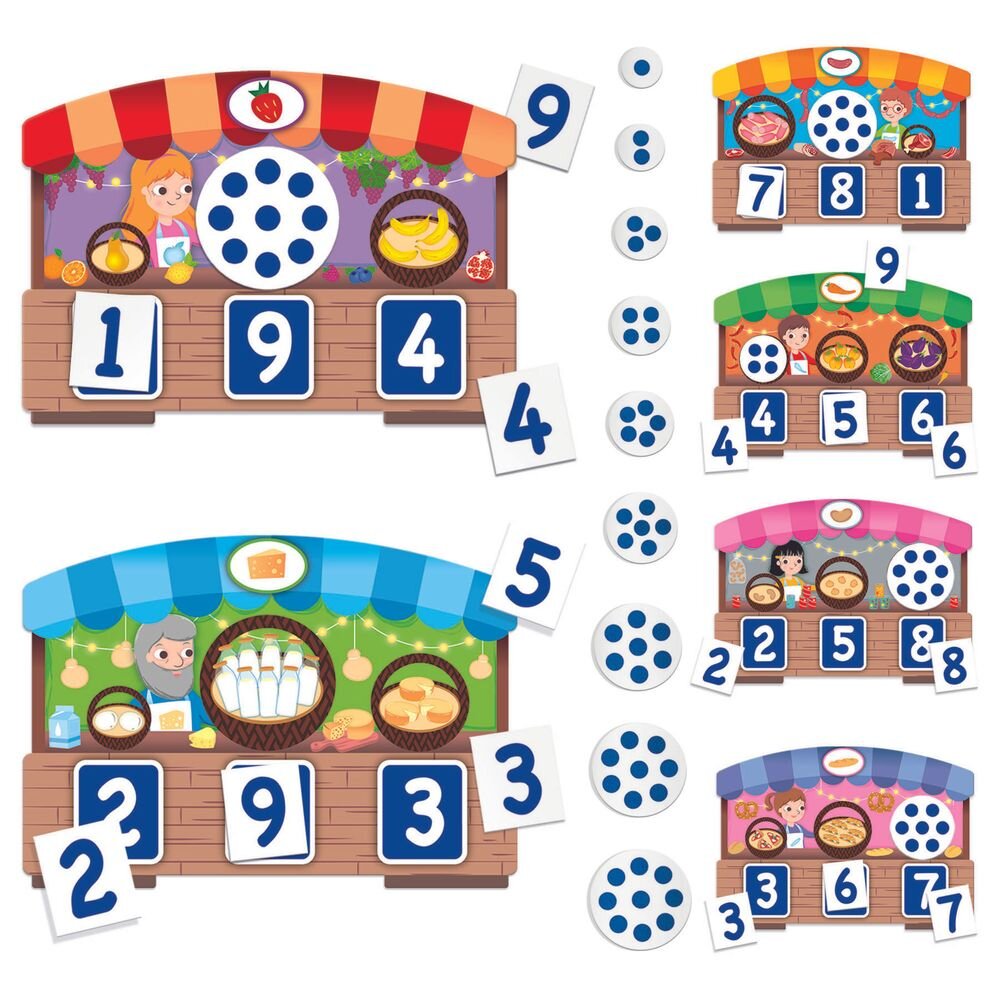 "Монтессорі: числа й кількість" - захоплива гра в сенсорне лото на маленькому намальованому ринку! Завдяки спеціально відшліфованим жетонам і прогресивним лічильникам від 1 до 9, діти можуть заповнювати власні картки цифрами та кількістю, навчаючись у такий спосіб рахунку, дізнаючись кількість і складаючи свої перші суми.
