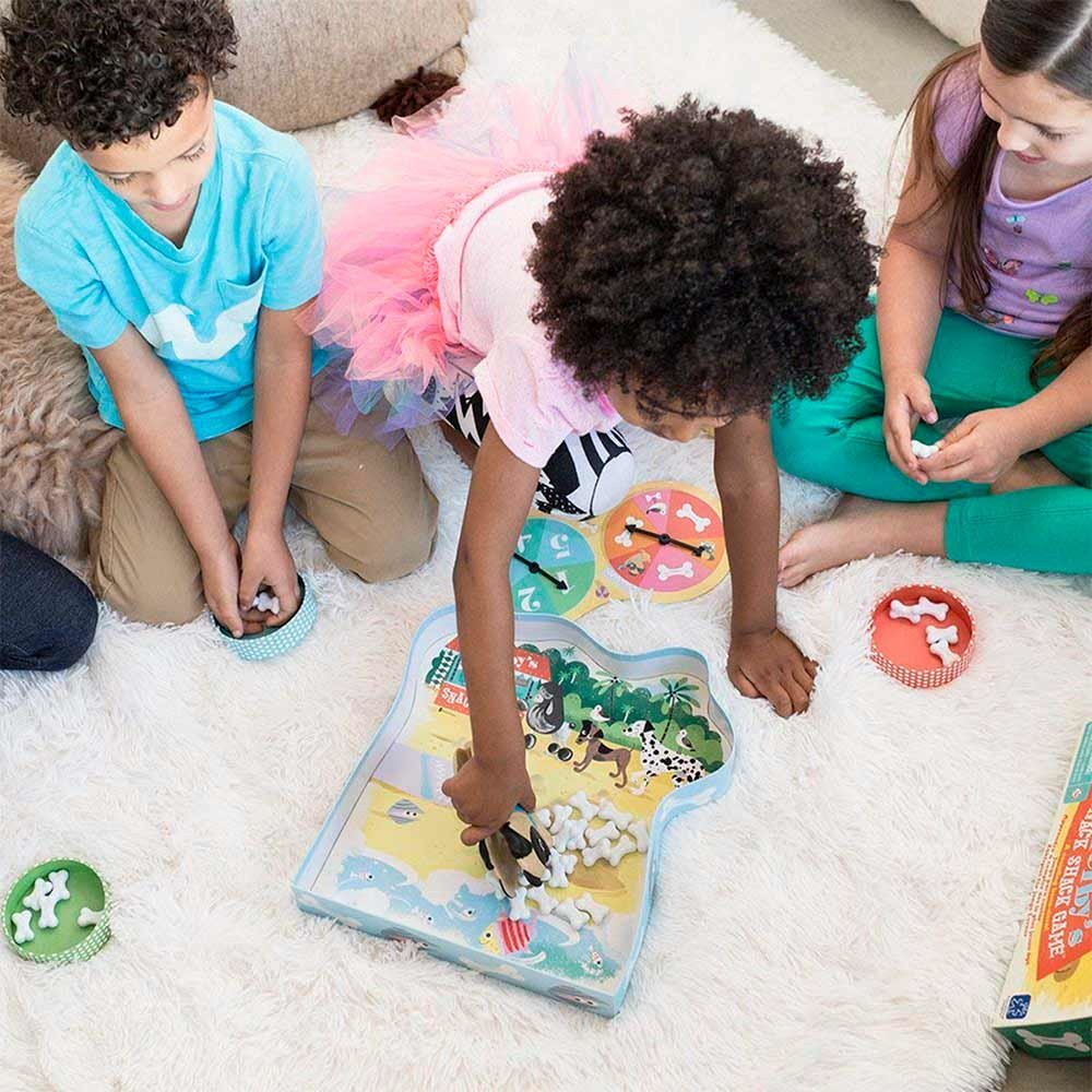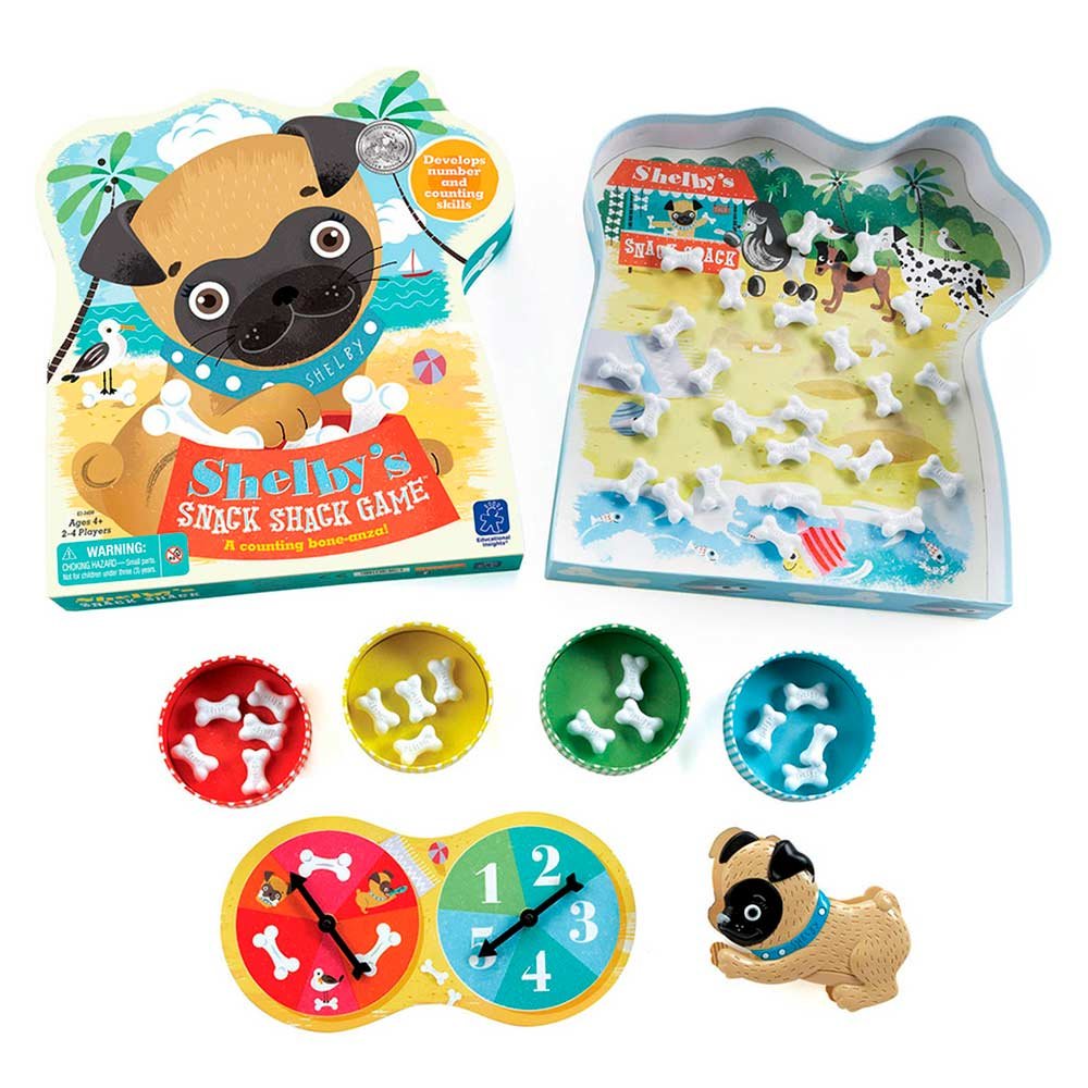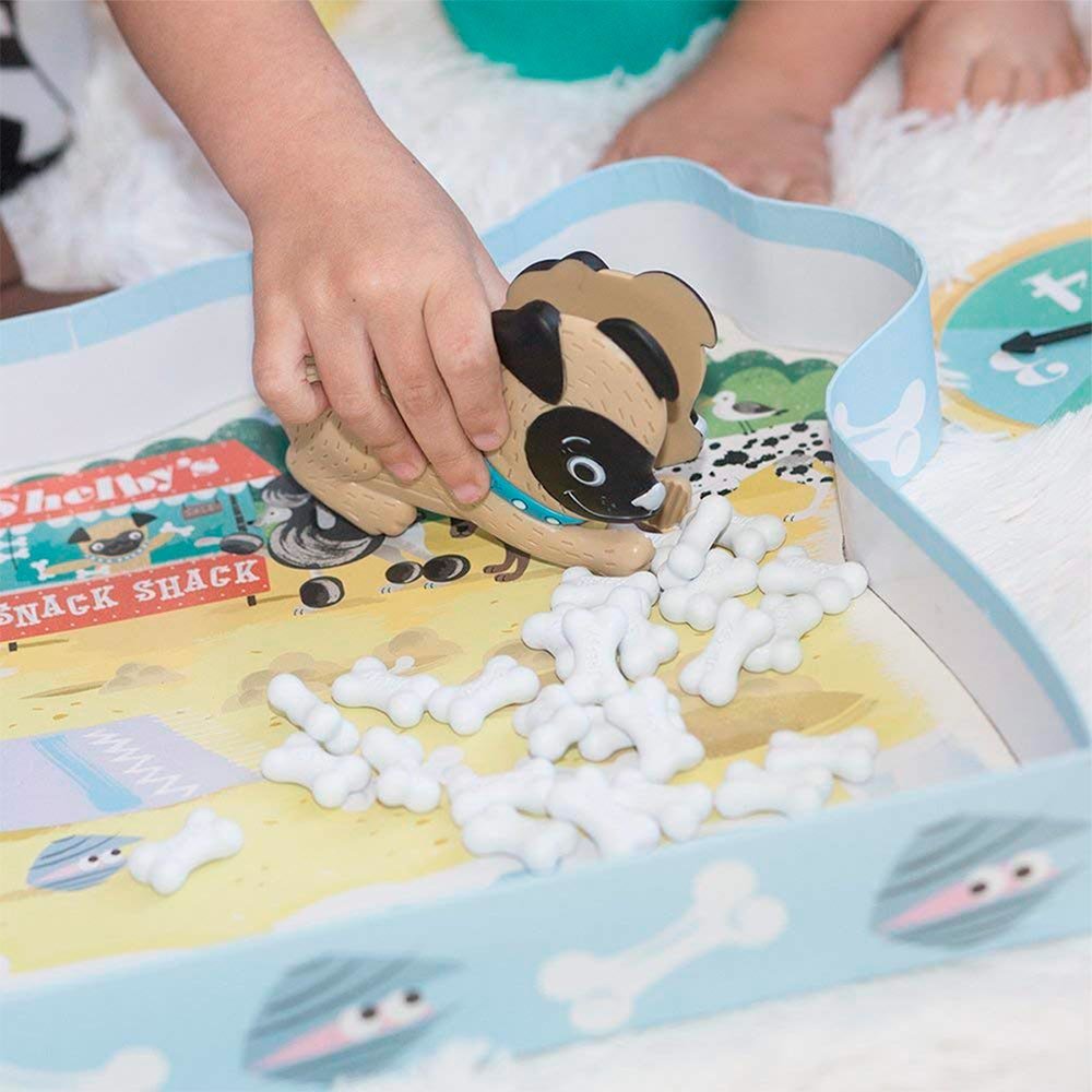 У наборі: щипчики у вигляді мопса; подвійна ігрова рулетка; 4 мисочки; 40 кісточок; інструкція.