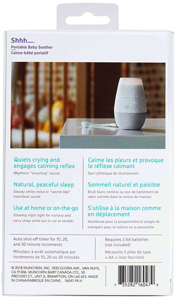 Особливості: 3 типи заспокійливих звуків — шепіт, білий шум, серцебиття. 2 режими м'якого світіння — постійне світло та мерехтіння. Таймер автоматичного вимкнення з інтервалами 10, 20 і 30 хвилин.