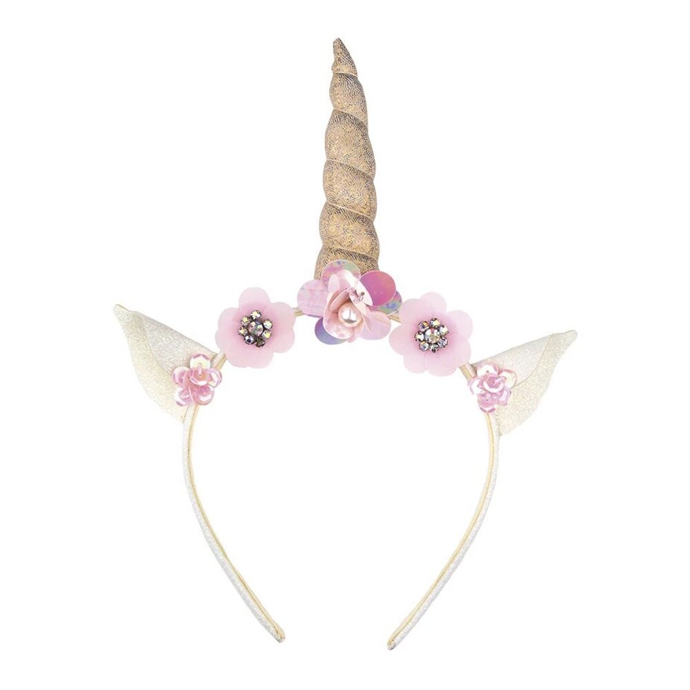 Ця прикраса має основу, прикрашену рожевими квіточками з блискітками та намистинками, а також вушка, ріг єдинорога, що сяє блиском.