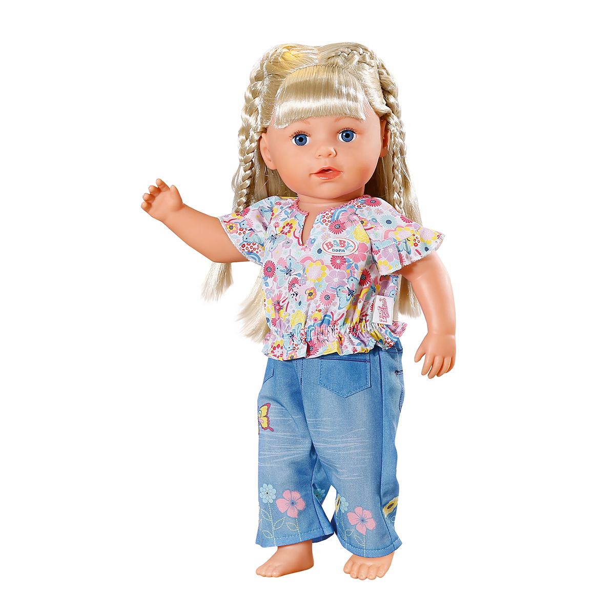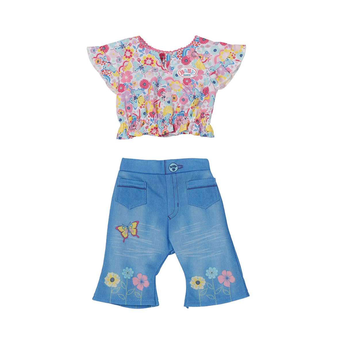 У лялечки з’явилося модне вбрання для цікавих мандрівок. Блуза вкрита квітами та має хвилясті рукави. Маленька дитина-квітка вдягнена в джинси-кльош з накладними кишенями. На них принтований чарівний метелик та інші квіти. Одяг виготовлено з високоякісних матеріалів.
