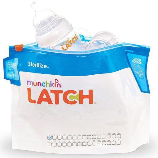 Пакети для стерилізації у мікрохвильовій печі Munchkin Latch дозволяють швидко знищити до 99.9% бактерій на дитячих пляшечках, сосках, пустушках, зубних кільцях, маленьких іграшках і приладах для грудного вигодовування. Для цього достатньо покласти предмети в пакет, додати води та помістити в мікрохвильову піч. В упаковці 6 пакетів, кожен з яких можна використовувати до 30 разів. Зручна сітка на кожному пакеті для позначок допоможе вам простежити, скільки разів ви вже використовували пакет.