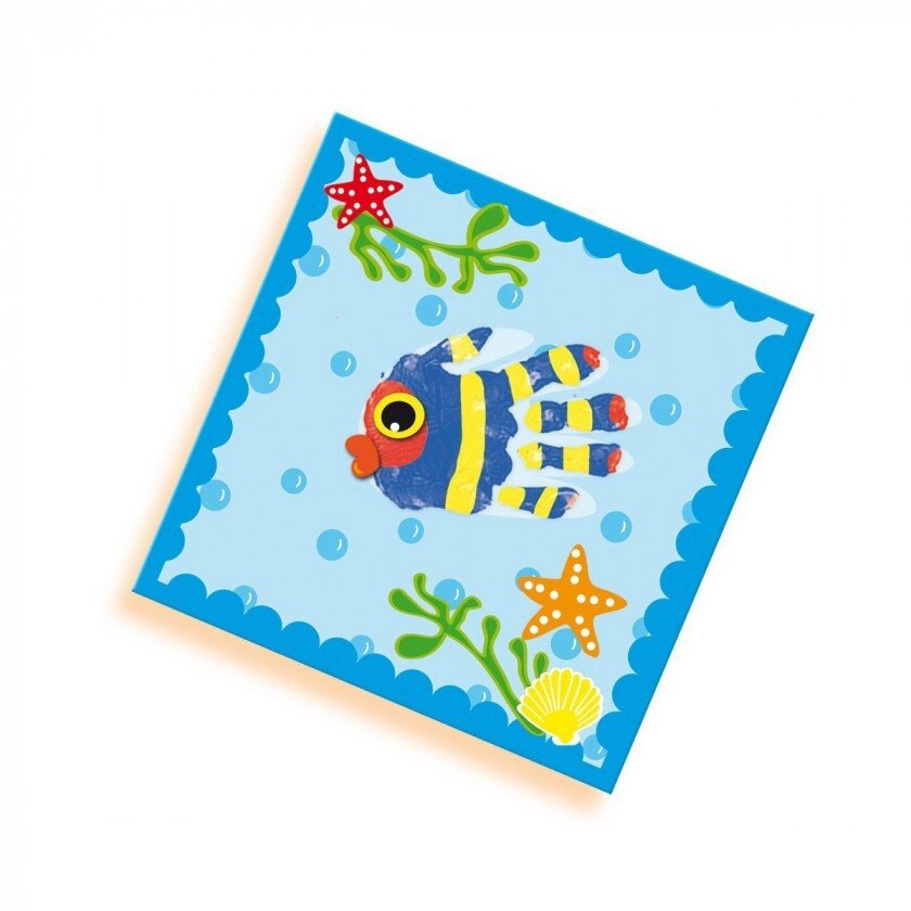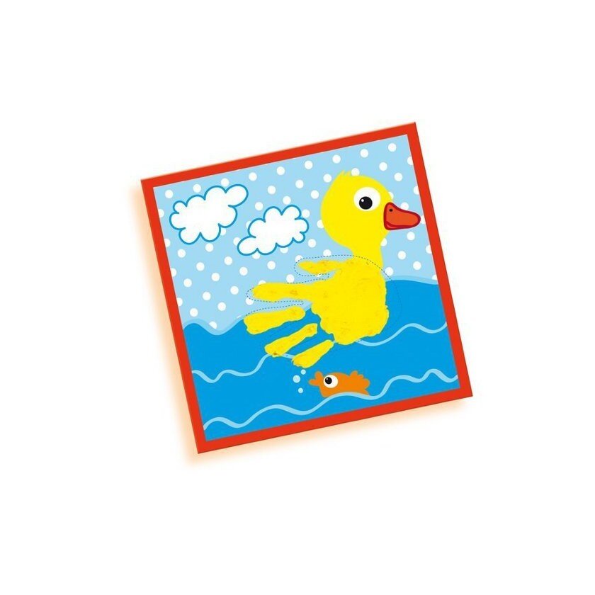 Прекрасний набір для знайомства малюка з малюванням. Він включає в себе 11 цікавих картинок, де позначено місце для відбитка. Кроха ручкою або ніжкою, змоченою у фарбі, завдає відбиток на шаблон, і виходить яскрава і весела картинка. У набір входить пензлик і друковані елементи (наприклад, очі), які відмінно доповнять Вашу роботу. Фарби повністю безпечні і екологічні. Ручки, ніжки і речі легко відмиваються мильною водою. Створюйте свої перші шедеври за допомогою пальчикових фарб і залишайте їх собі на пам'ять.