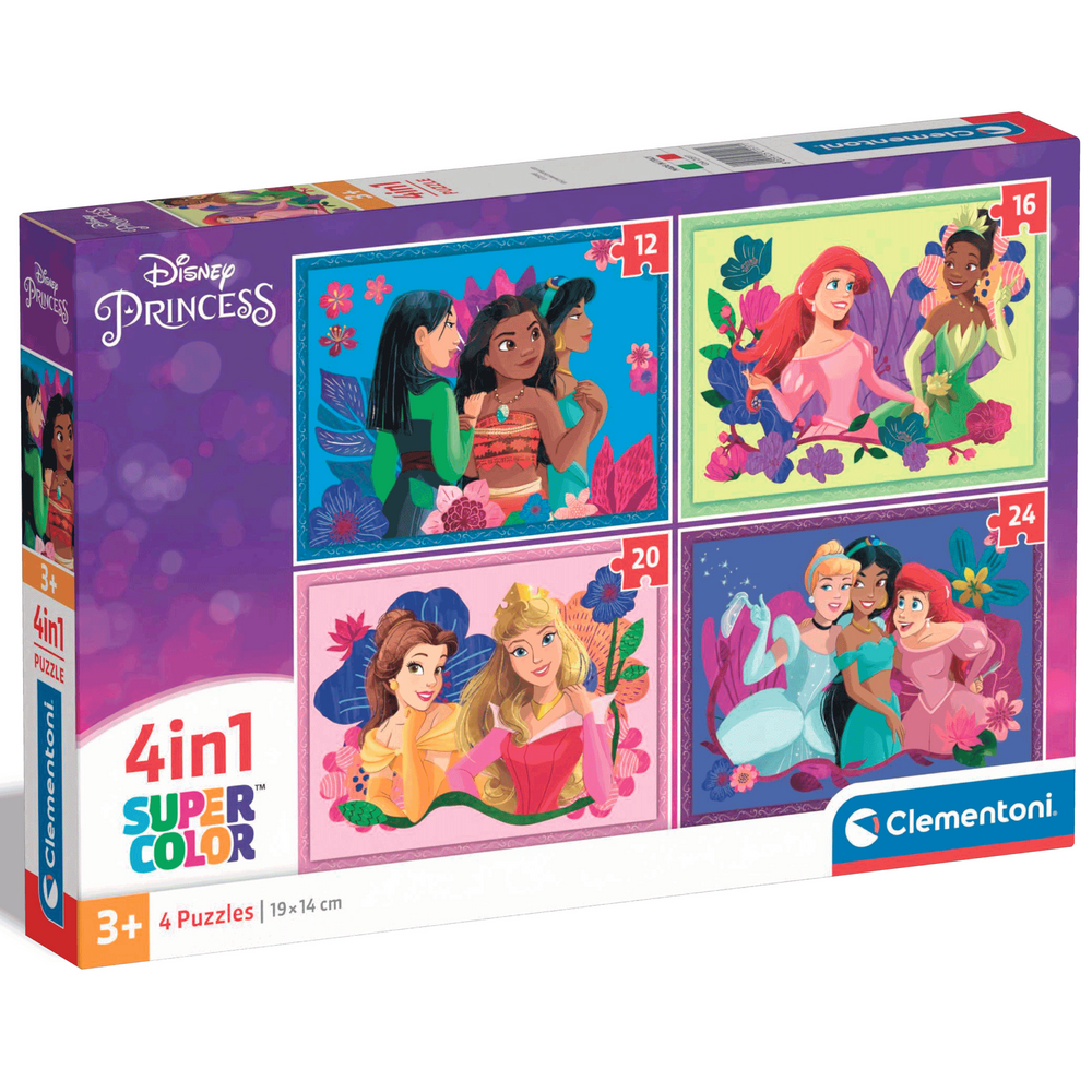 Набір пазлів Clementoni "Princess" 4 в 1 із зображенням чарівних принцес Діснея – Белль, Попелюшки, Білосніжки, Сплячої Красуні, Аріель, Покахонтас, Тіани, Моани та Жасмін.