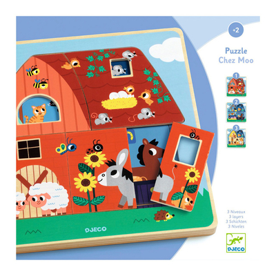 Пазл DJECO Ферма — тришарова дерев’яна головоломка з 12 частин. Є кілька частин, які потрібно зібрати разом, щоб пройти кожний рівень.