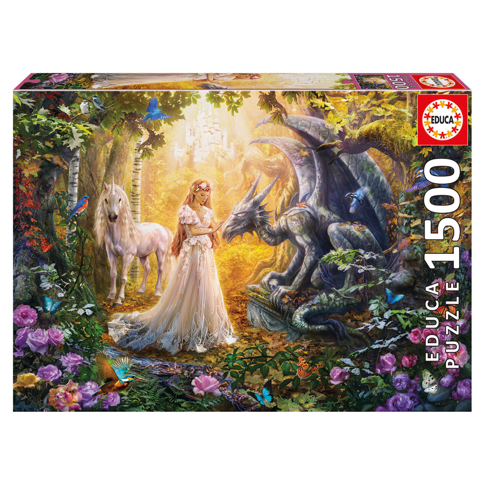 Настільна гра від іспанського бренду EDUCA сподобається дітям від 14 до 18 років. Яскраве зображення у стилі фентезі дракону, принцеси та єдинорога складається зі 1500 дрібних елементів. Пазли виготовлені з щільного картону.