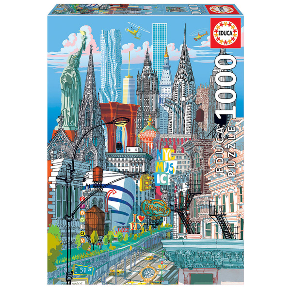 Настільна гра від іспанського бренду EDUCA сподобається дітям від 14 до 18 років. Яскраве зображення ілюстрації "Нью-Йорк" Карло Станга складається зі 1000 дрібних елементів. Пазли виготовлені з щільного картону.