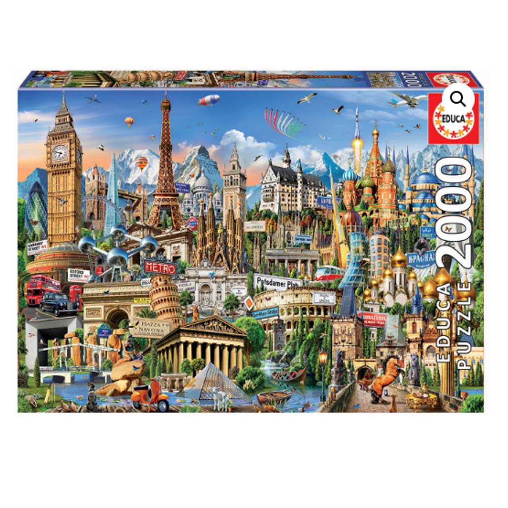 Настільна гра від іспанського бренду EDUCA сподобається дітям від 14 до 18 років. Яскраве зображення найбільш знаних пам'яток Європи складається з 2000 дрібних елементів. Пазли виготовлені з щільного картону.