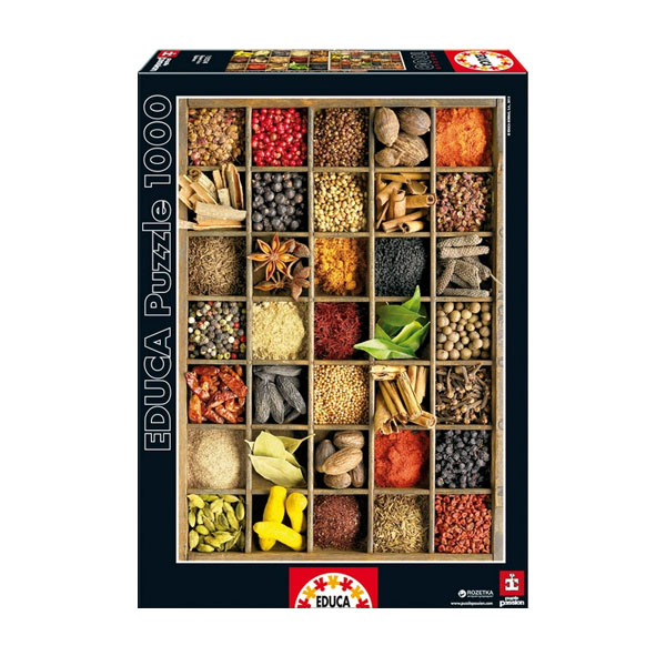 Настільна гра від іспанського бренду EDUCA сподобається дітям від 14 до 18 років. Яскраве зображення сету приправ складається зі 1000 дрібних елементів. Пазли виготовлені з щільного картону.