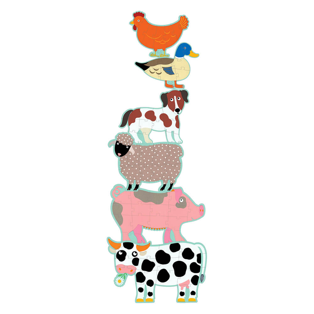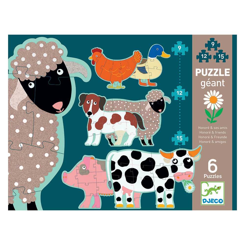 Захопливий ігровий набір пазлів від французського бренду Djecо пропонує зібрати відомих домашніх тварин. У наборі представлені: 2 комплекти з 9 елементів для складання курки та качки; 2 комплекти з 12 елементів, що дозволяють зібрати собаку та вівцю; 2 комплекти на 15 елементів, з яких можна скласти корову та свиню.