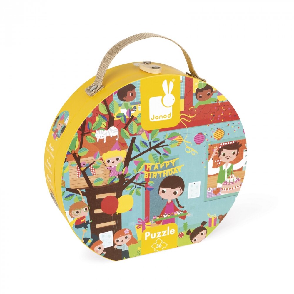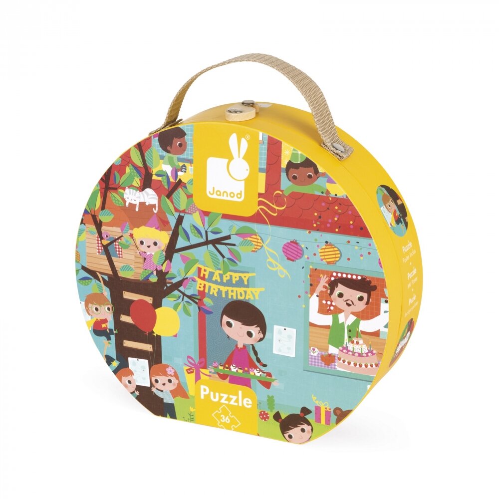 Пазл у яскравій, якісній коробці-валізі з ручкою – для дітей, віком від 4 років. Якісна іграшка бренду Janod виготовлена з безпечних, надійних матеріалів. І коробка, і деталі пазлу – картонні. При цьому він цупкий, не гнеться, пазл можна збирати нескінченну кількість разів і деталі не деформуються. Зібрана картинка не прямокутна, як більшість пазлів, вона у формі будиночка. Малюнок чудово відповідає темі «день народження», а тому – це чудовий подарунок на свято.