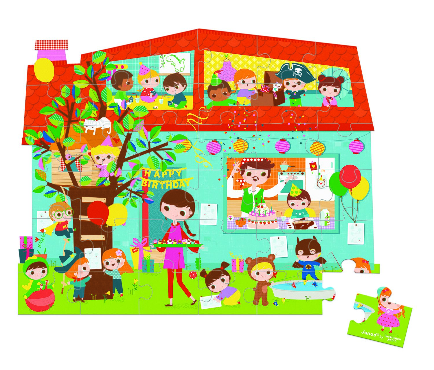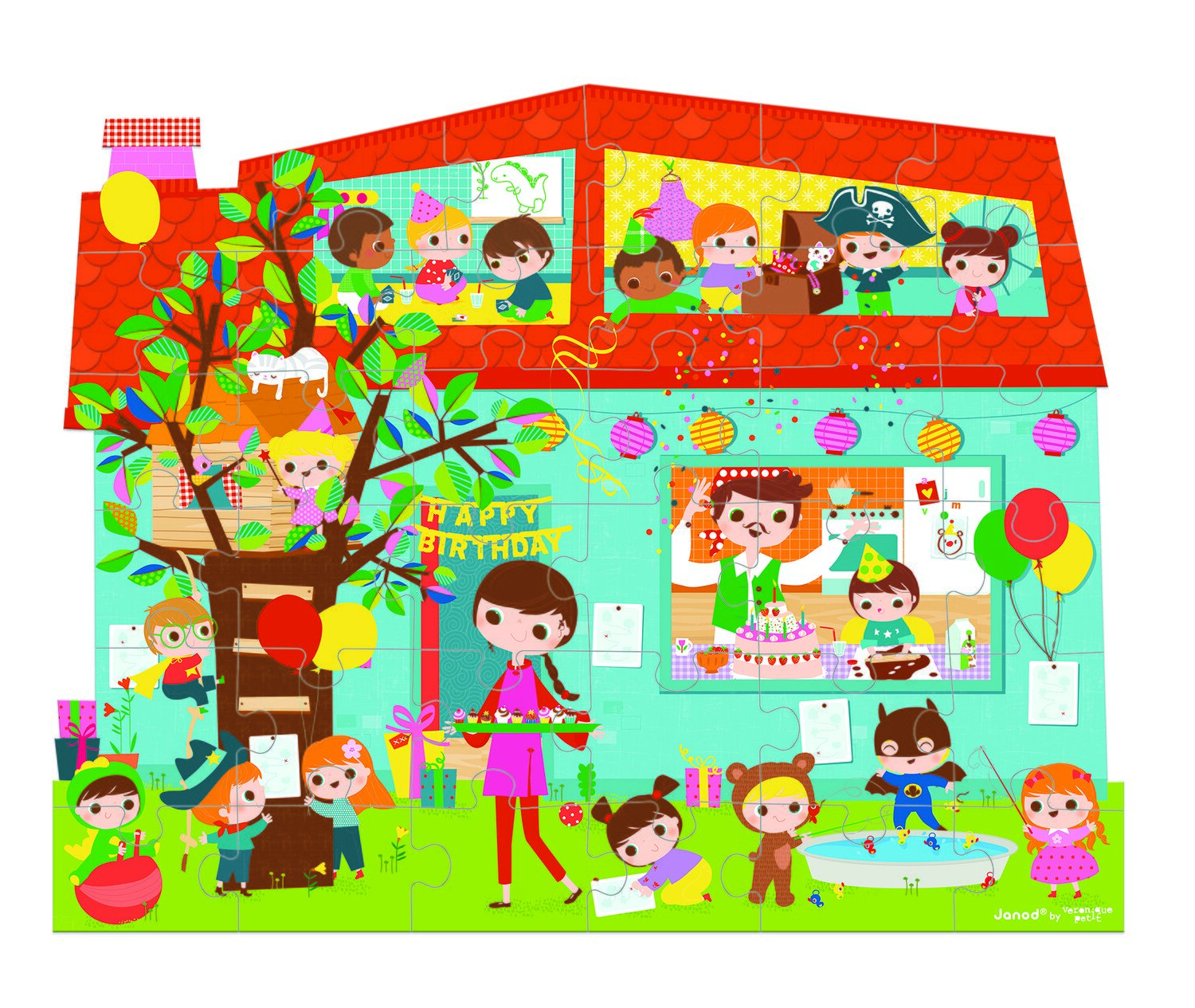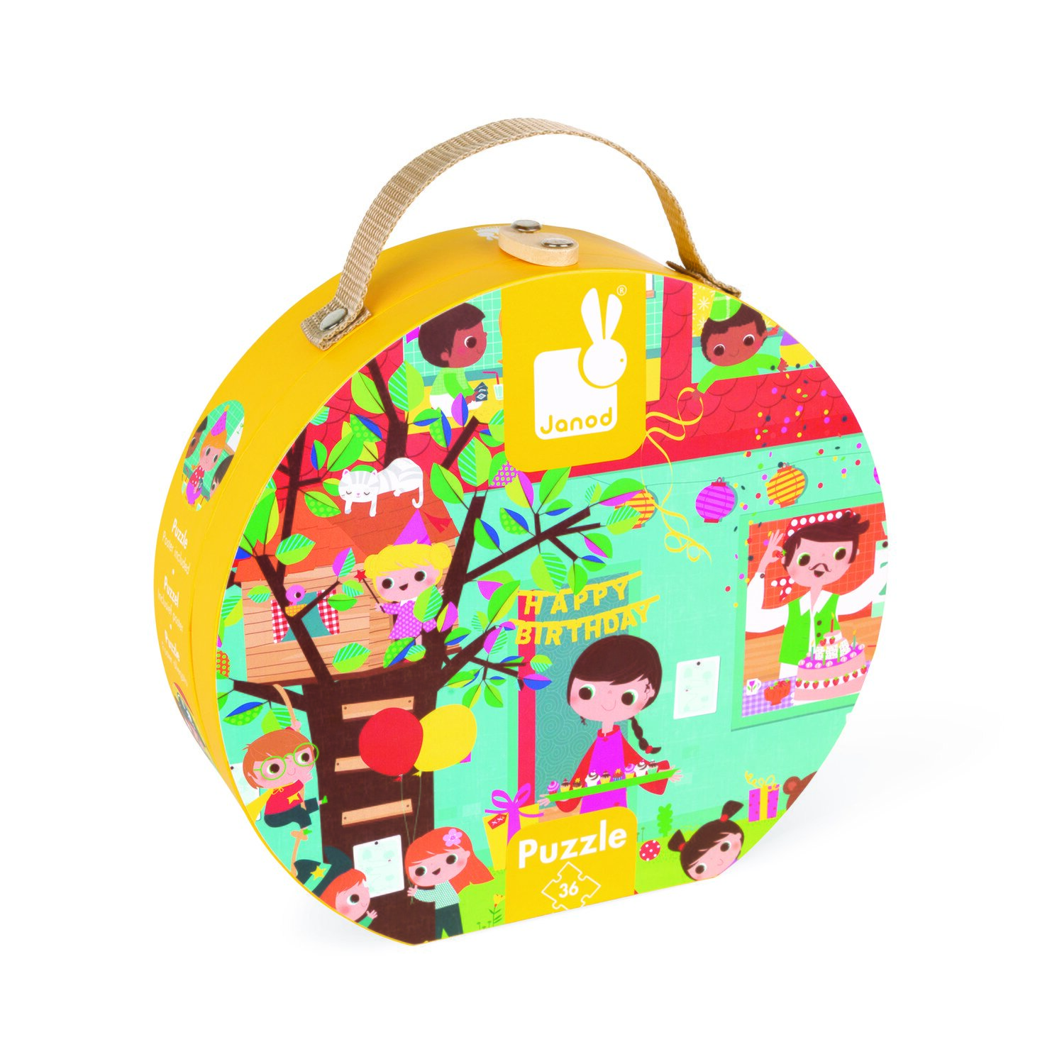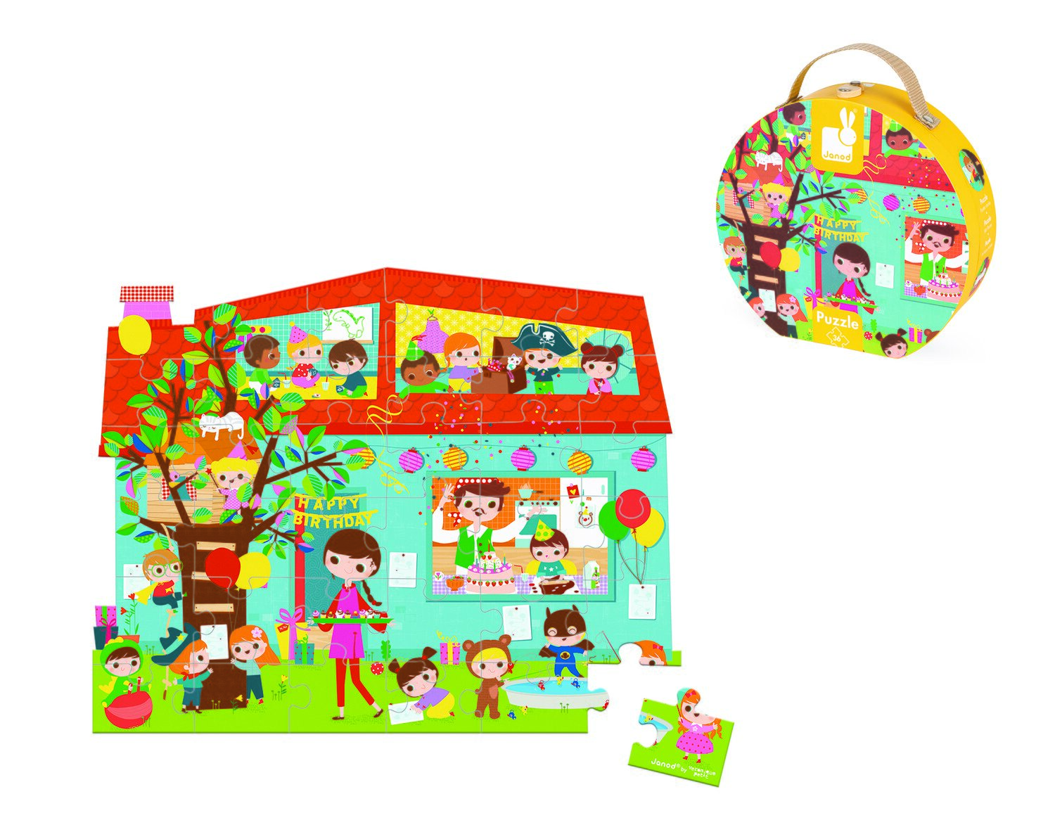 Пазл в яскравій, якісної коробці-валізі з ручкою – для дітей у віці від 4 років. Якісна іграшка бренду Janod виготовлена з безпечних, надійних матеріалів. І коробка, і деталі пазла – картонні. При цьому він щільний, не гнеться, пазл можна збирати нескінченну кількість разів і деталі не деформуються. Зібрана картинка не прямокутна, як більшість пазлів, вона в формі будиночка. Малюнок прекрасно відповідає темі «день народження», а тому – це чудовий подарунок на свято.
