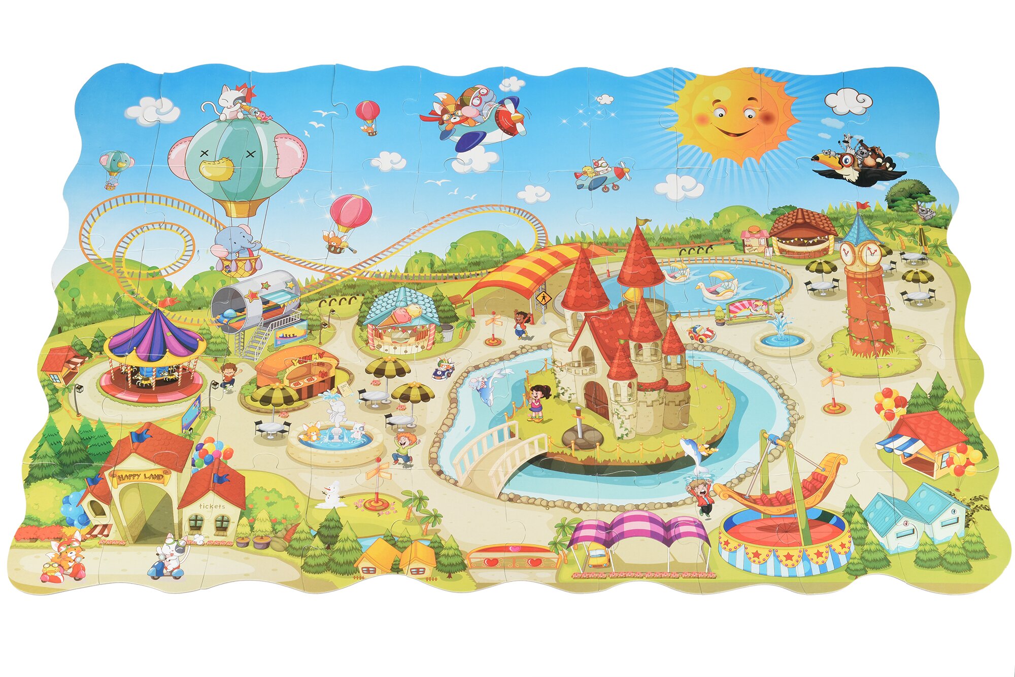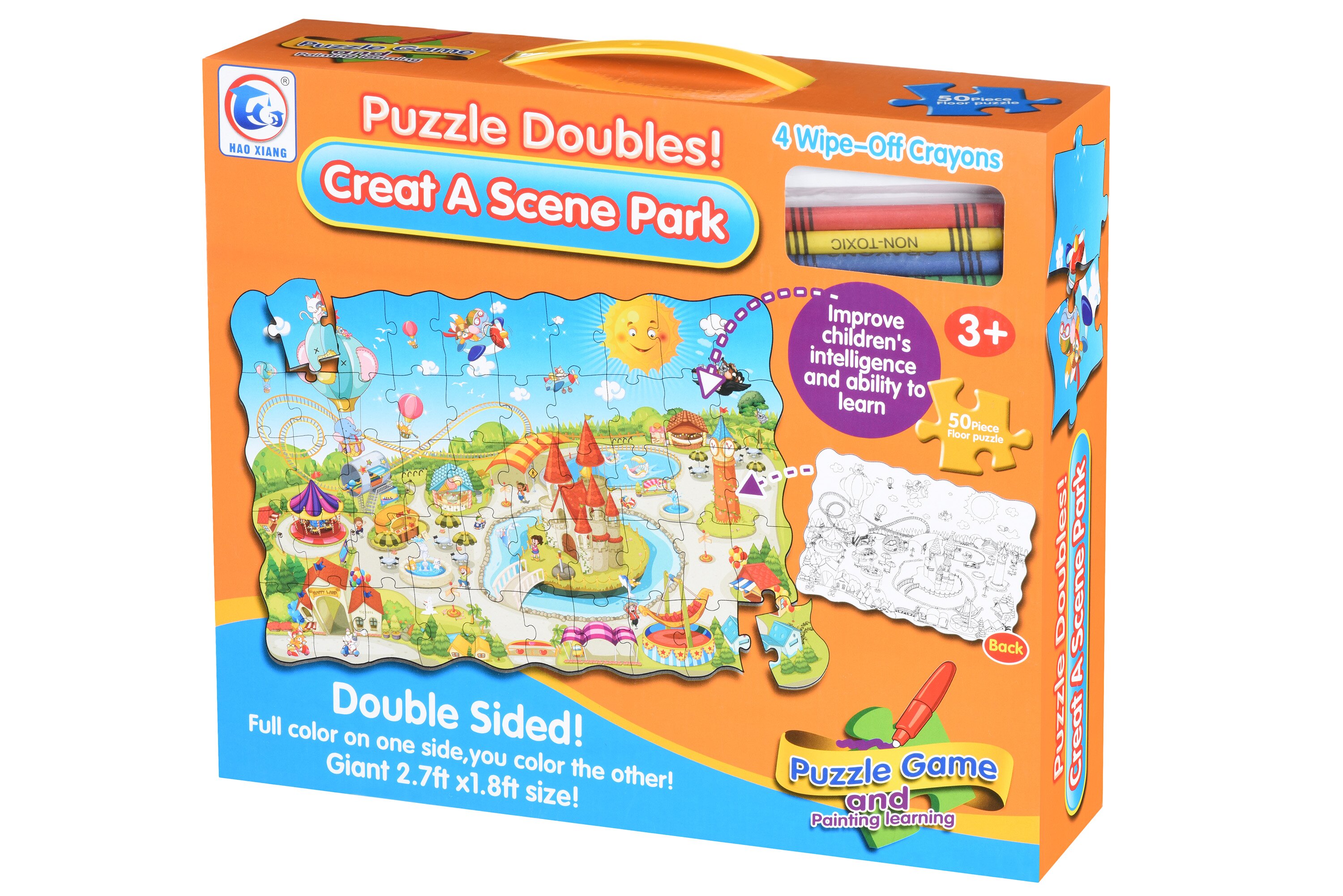 Незвичайний пазл «Парк розваг» іграшка 2 в 1: одночасно пазл і розфарбування. Пазл складається з 50 фрагментів з яскравим зображенням на лицьовій стороні. На звороті – те ж зображення, тільки чорно-біле. Фрагменти пазла виготовлені з щільного картону, вони не гнуться, а на дотик гладкі. зібравши пазл, дитина може перевернути його на «чорно-білу» сторону і розфарбувати. Для цього в наборі 4 кольорові воскові олівці. Зібрана картинка розміром 82х54 см. Збираючи пазл, діти будуть розвивати дрібну моторику, координацію і спритність рухів, а шукаючи необхідне місце для вкладкаа, пам'ять і логічне мислення.