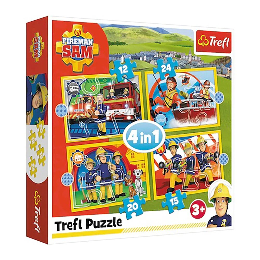 Набір, що складається з пазлів на 12, 15, 20 та 24 елементи в одній упаковці, із зображеннями героїв мультфільму "Пожежник Сем". Після укладання ви отримуєте 4 картинки розміром 20х28 см.