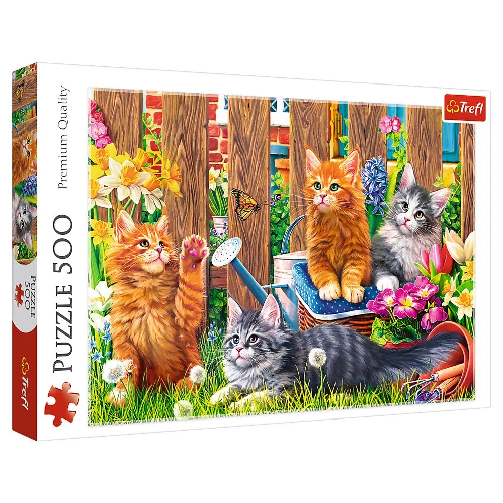 "Котики в саду" - настільна гра для дітей старше 10 років. І картина, яку необхідно створити самому, - зображення чотирьох чарівних пухнастих котиків у літньому саду. Складається з 500 пазлів з щільного картону. Розвиває дрібну моторику, логічне та просторове мислення, посидючість, уважність. Виробник - Trefl (Польща).