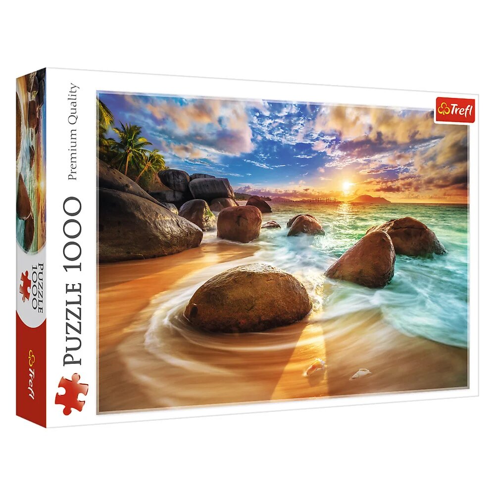 Пазли Trefl - настільна гра для дітей старше 10 років і картина, яку необхідно скласти самому. "Пляж Самудра" - мальовниче зображення куточка узбережжя Аравійського моря. Картина складається з 1000 пазлів з щільного картону. Набір розвиває дрібну моторику, логічне та просторове мислення, посидючість, уважність. Виробник - Trefl (Польща).