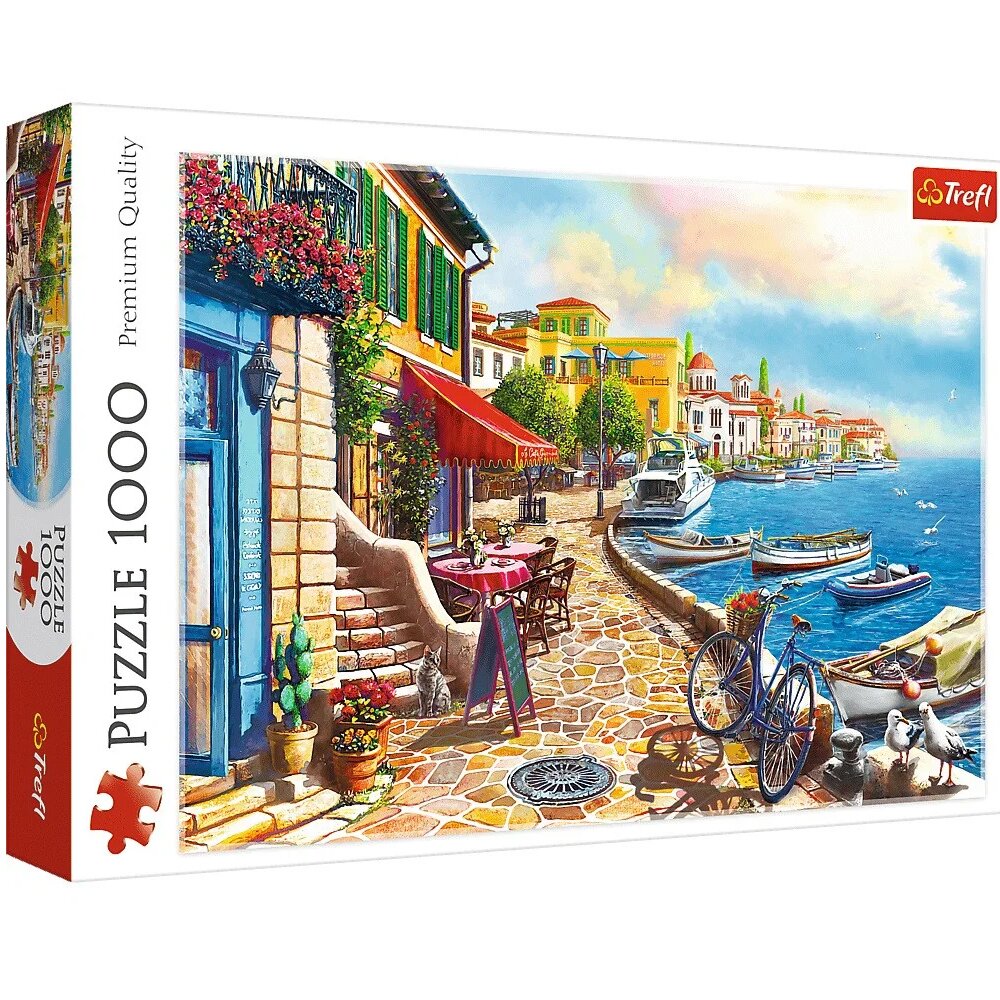"Сонячний бульвар" Trefl - настільна гра для дітей старше 10 років і картина, яку необхідно скласти самому. Це зображення залитого ранковим сонцем морського променаду невеликого курортного містечка. Складається з 1000 пазлів з щільного картону. Розвиває дрібну моторику, логічне та просторове мислення, посидючість, уважність. Виробник - Trefl (Польща).