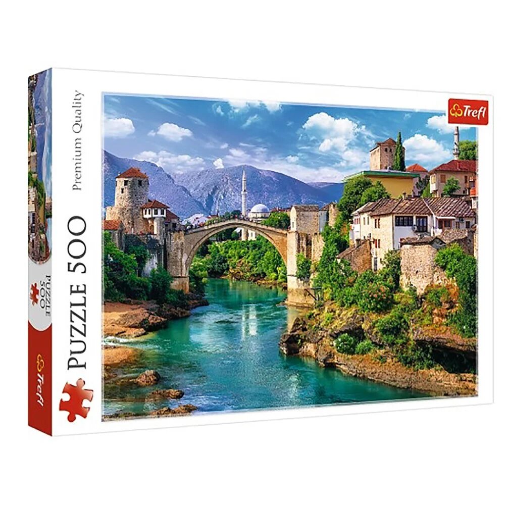 "Старий міст у місті Мостар" Trefl - настільна гра для дітей старше 10 років і картина, яку необхідно скласти самому. Це зображення старовинного кам'яного мосту, що вже 4 століття вважається символом цього міста в Боснії і Герцеговині. Складається з 500 пазлів з щільного картону. Розвиває дрібну моторику, логічне та просторове мислення, посидючість, уважність. Виробник - Trefl (Польща).