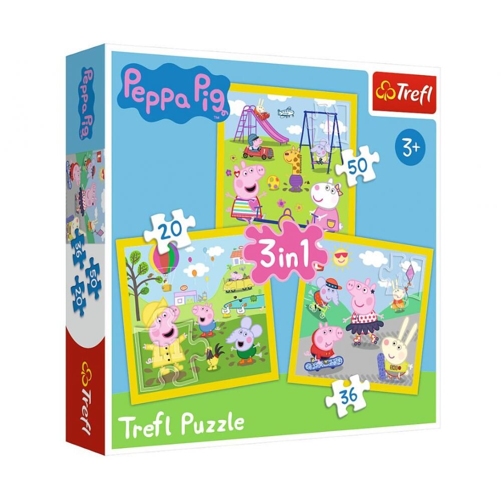 Набір, що складається з пазлів 3 в 1 на 20, 36 та 50 елементів із зображенням героїв мультфільму "Свинка Пепа". Після укладання ми отримуємо три картинки розміром 20х20 см.
