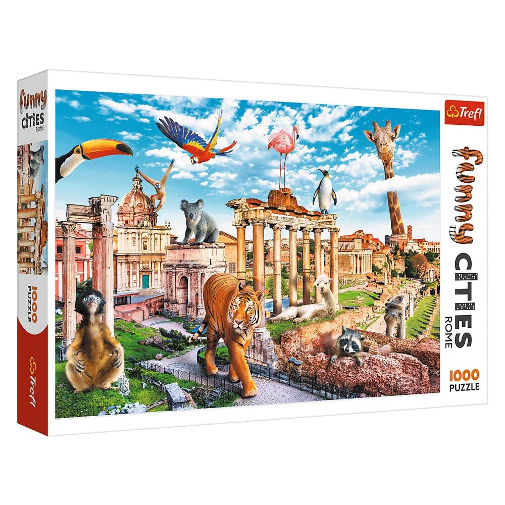 "Дикий Рим" Trefl - настільна гра серії "Веселі міста" для дітей старше 10 років і картина, яку необхідно скласти самому. Це гумористичне зображення, яке пропонує в жартівливому тоні подивитися на всім відоме й улюблене місто. Складається з 1000 пазлів з щільного картону. Розвиває дрібну моторику, логічне та просторове мислення, посидючість, уважність. Виробник - Trefl (Польща).