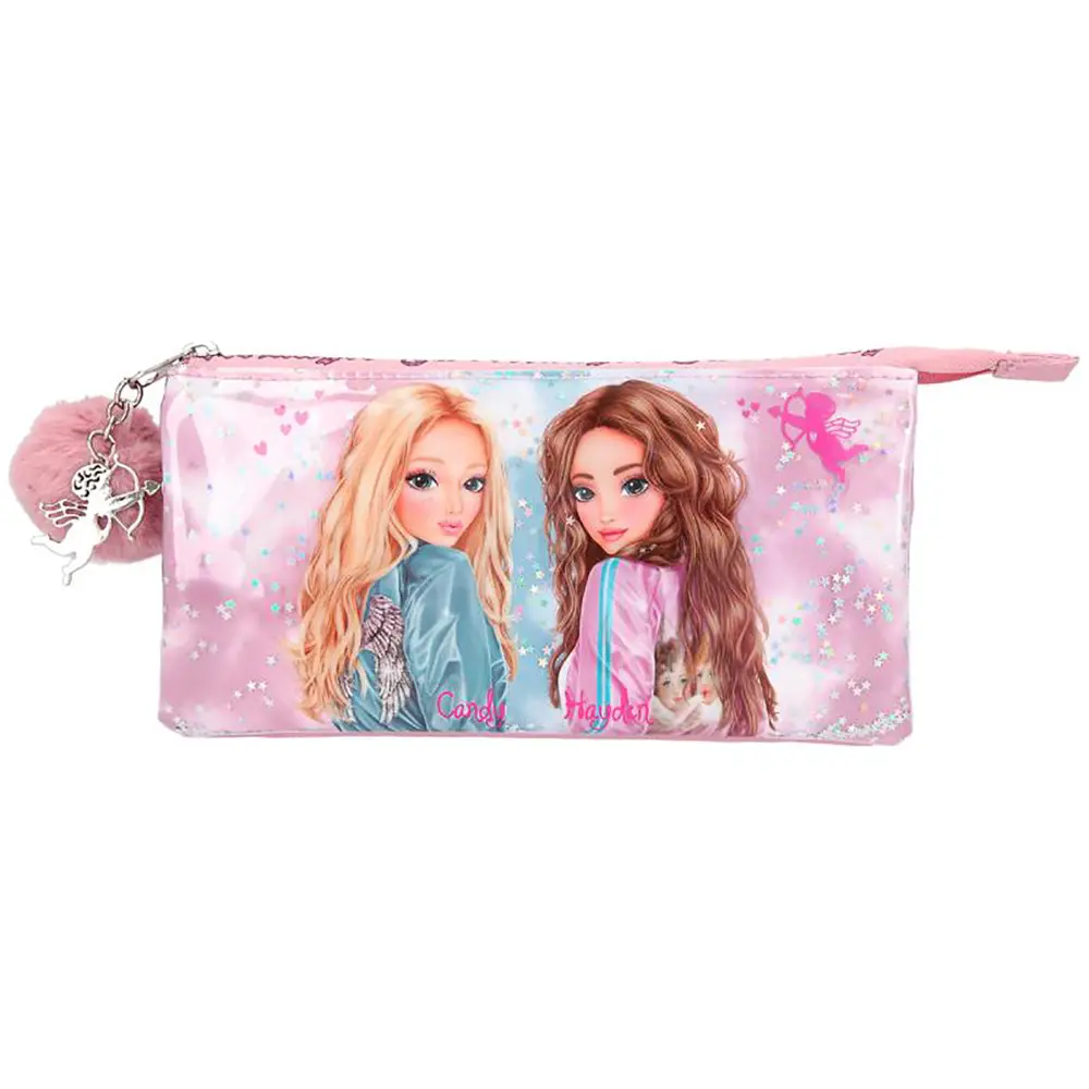 Потрійний пенал з наповненням. Виготовлений з високоякісного штучного хутра (задня сторона). Передня сторона пеналу прикрашена зображенням моделей на іскристому мільйонами блискіток тлі. Блискітки знаходяться під захисним шаром. Вони не опадають і не стираються з часом. На блискавці підвіска Купідон.