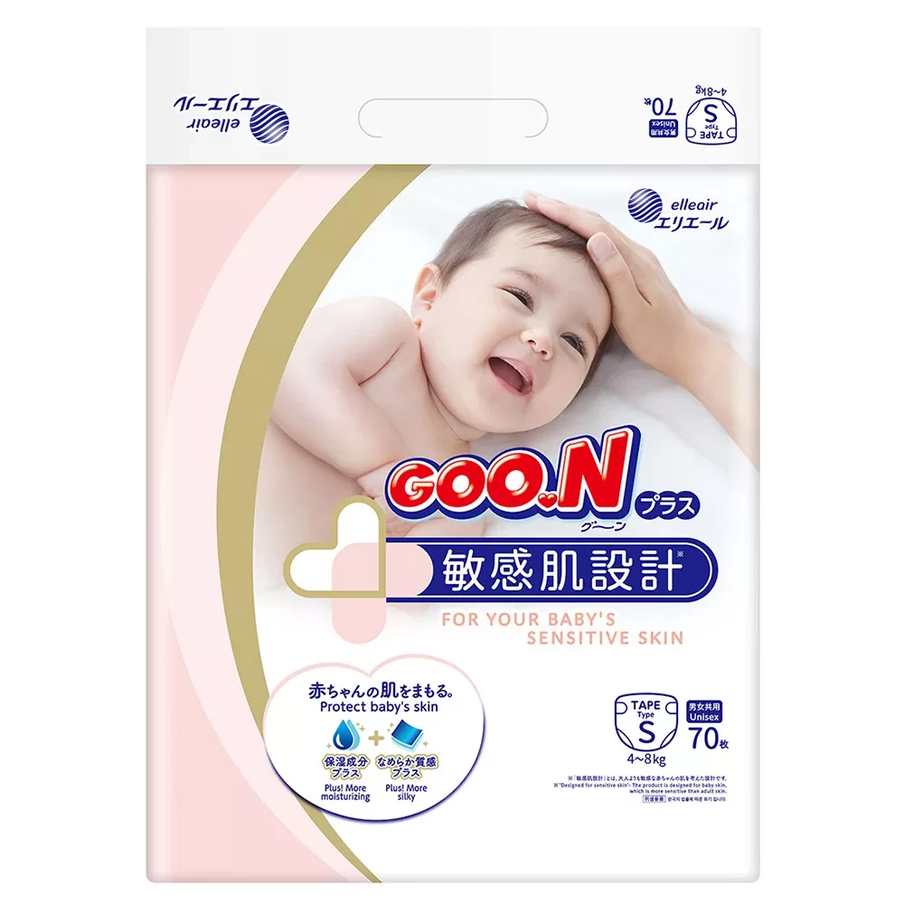 Японські підгузки Goo.N Plus для дітей (S, 4-8 кг) враховують особливості шкіри малюків* та запобігають подразненням та сухості.