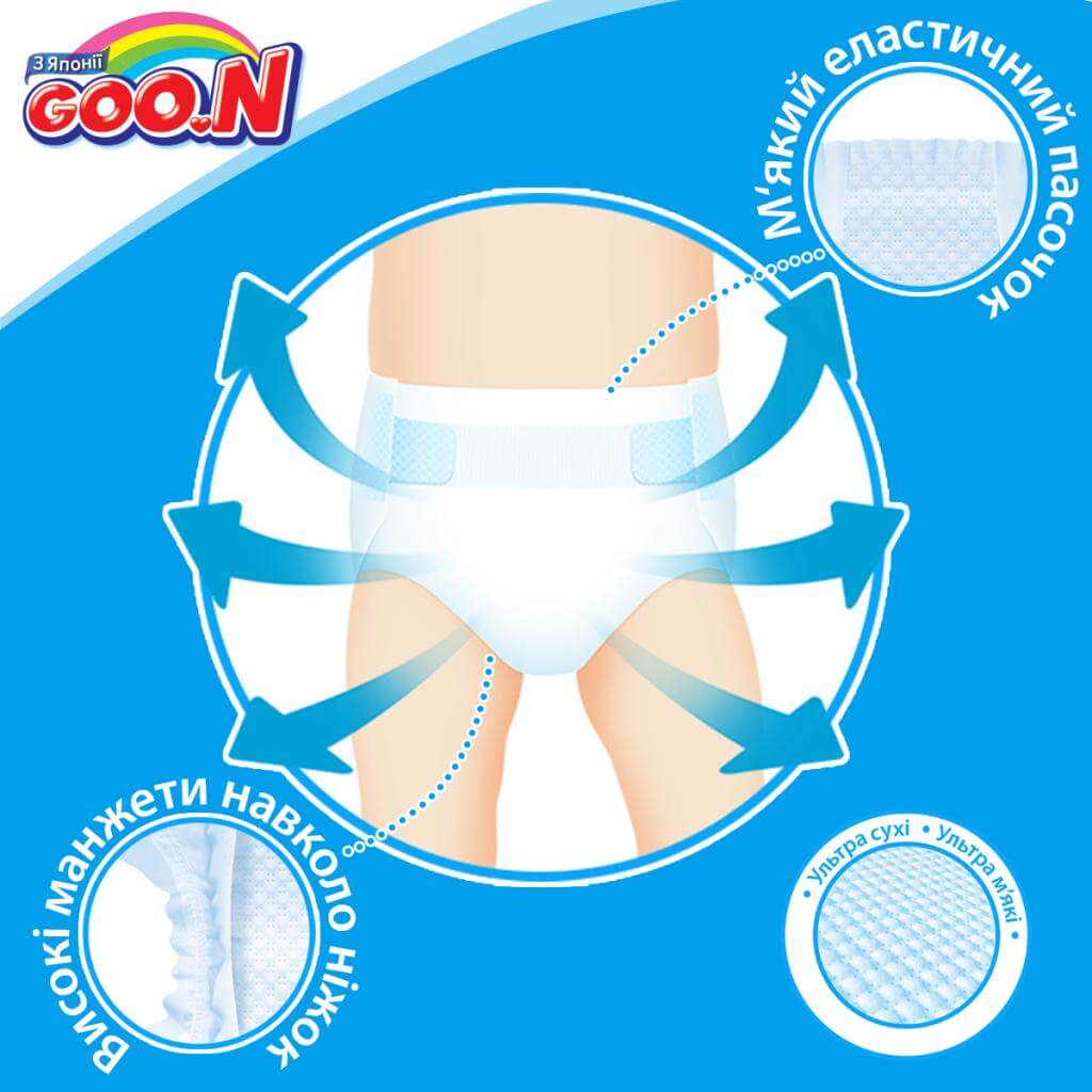 Японські підгузки GOO.N створені, щоб малюк був здоровий, а його шкіра залишалася сухою та гладенькою! Мають м'яку сітчасту зовнішню поверхню, через яку всередину трусиків пропускається повітря, а назовні виводиться піт. Мембранна плівка забезпечує абсолютну повітропроникність гігієнічного засобу. Підгузки "Гун" дарують малюкам максимальну ніжність за рахунок внутрішнього шару, неймовірного по своїй м'якості. Рідина миттєво всмоктується в 3D-поверхню і замикається у суперабсорбенті. Хвиляста поверхня підгузника з вітаміном Е тільки злегка торкається ніжної шкіри дитини, що попереджає появу подразнень і попрілостей. Є індикатор-нагадування про зміну підгузника. Передбачена нейтралізація неприємного запаху. Ще одна перевага дитячих трусиків - комфортна посадка без слідів на шкірі. З оновленої упаковки посміхаються малюки, які знають, що Goo.N - знак турботи і любові!