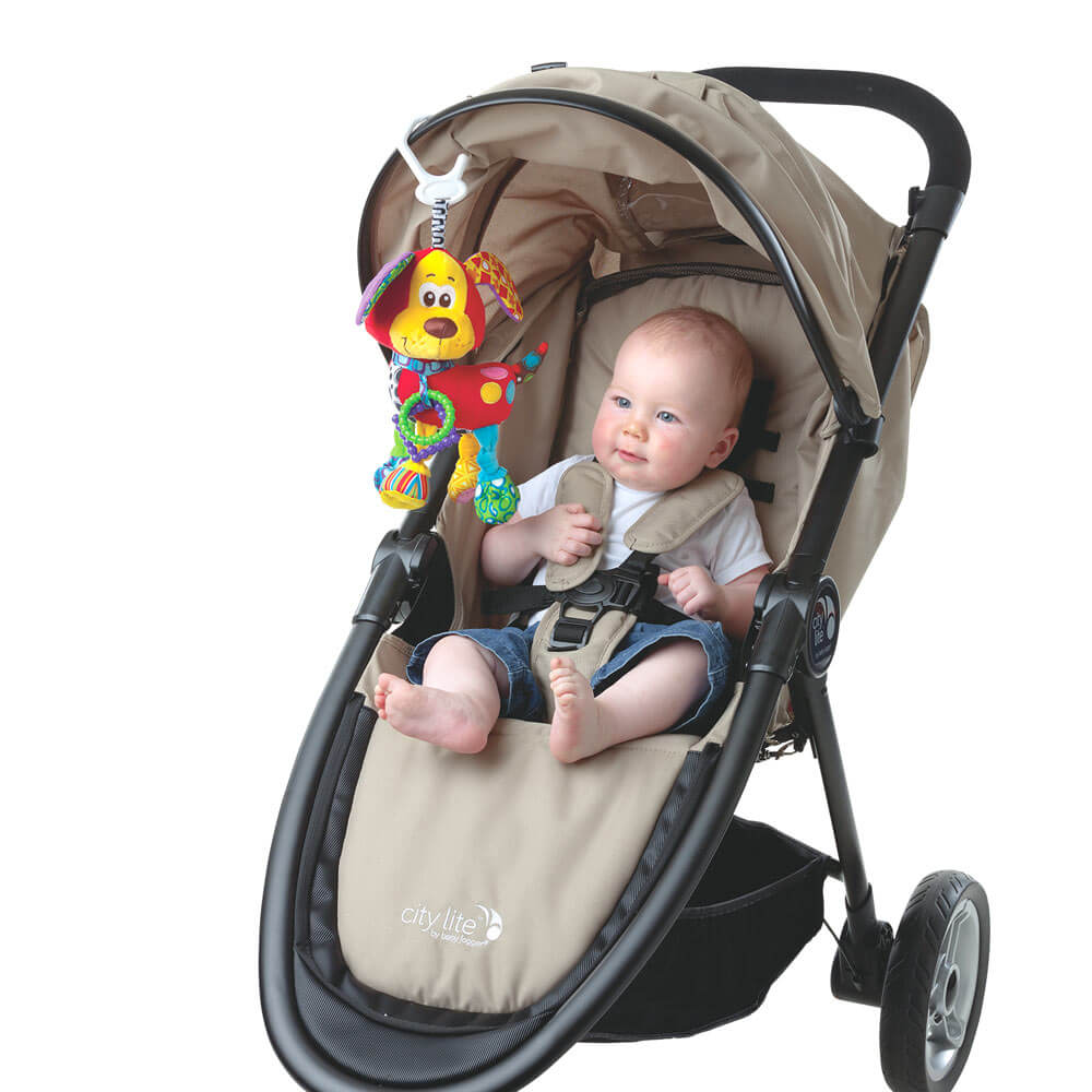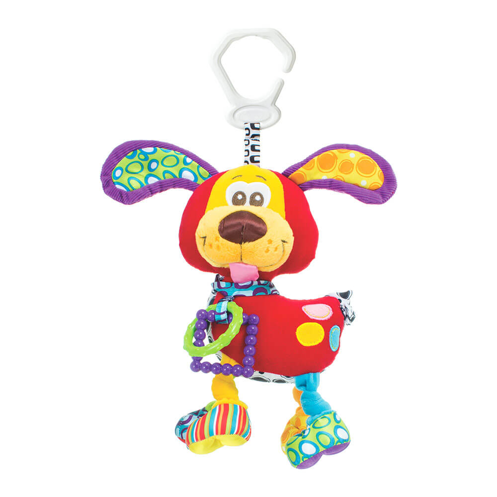 Усередині підвіски знаходяться дрібні кульки, які торохтять подібно брязкальцям. Для масажу ніжних ясен малюка під час прорізування зубів передбачений рельєфний гризунець. Щеня кріпиться на візок, автокрісло або ліжечко за допомогою пластикової кліпси.