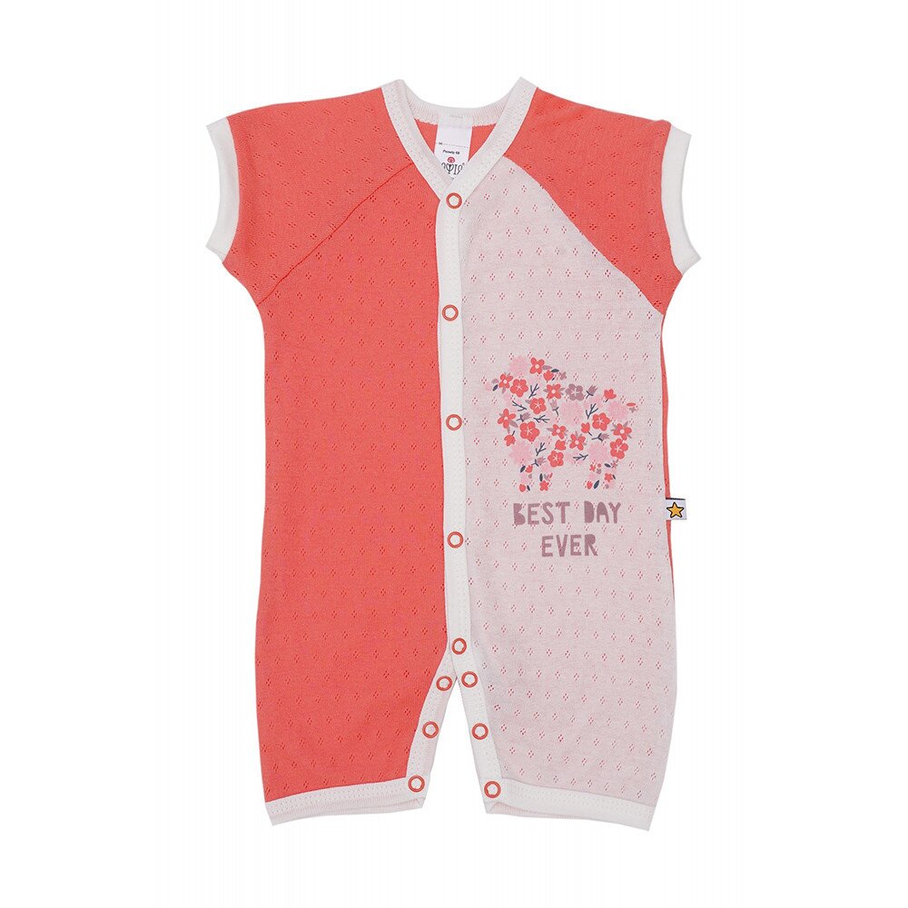 Легке літнє вбрання для малюка 9 - 12 місяців, пошитий з тонкого, приємного на дотик трикотажу "ажур". Пісочник з короткими рукавами-реглан та короткими штанинами виконаний у ніжній блакитній гамі, прикрашений кумедною вишивкою. Застібається на кнопки спереду. Для зручної заміни підгузки є застібка між ніжками.
