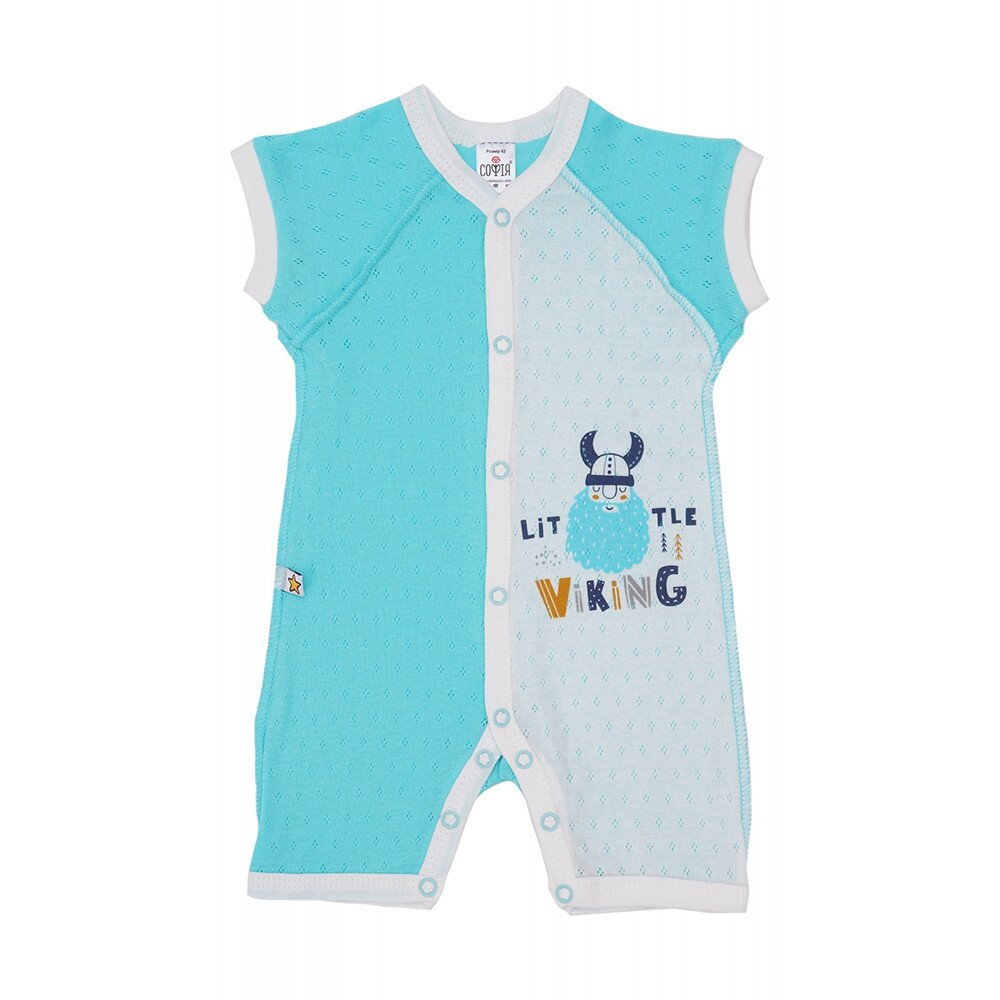Легке літнє вбрання для малюка 6 - 9 місяців, пошитий з тонкого, приємного на дотик трикотажу "ажур". Пісочник з короткими рукавами-реглан та короткими штанинами виконаний у ніжній блакитній гамі, прикрашений кумедною вишивкою. Застібається на кнопки спереду. Для зручної заміни підгузки є застібка між ніжками.
