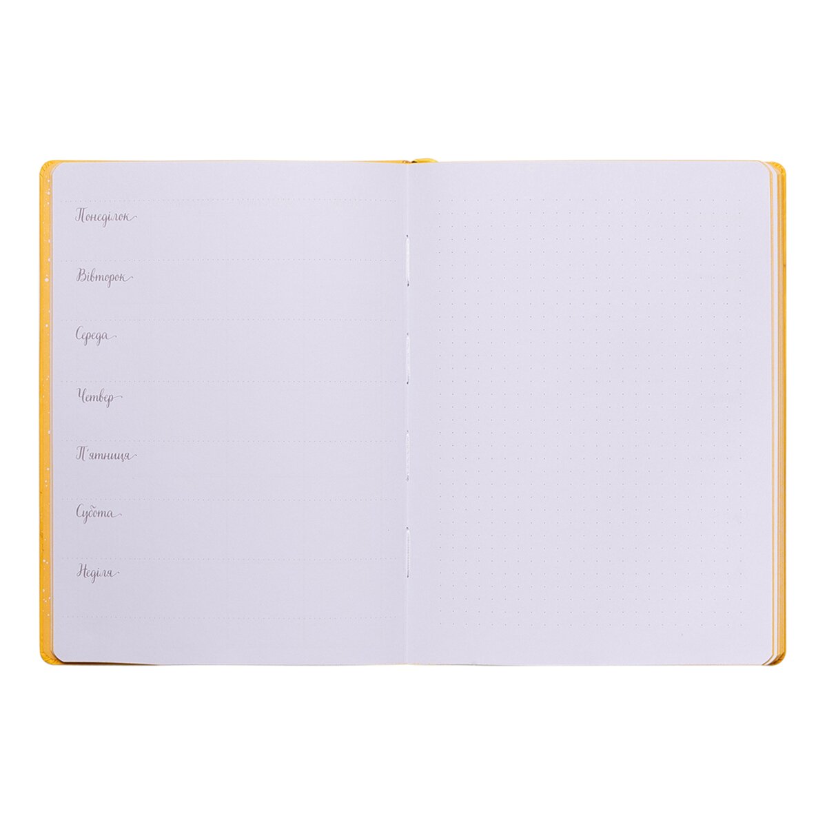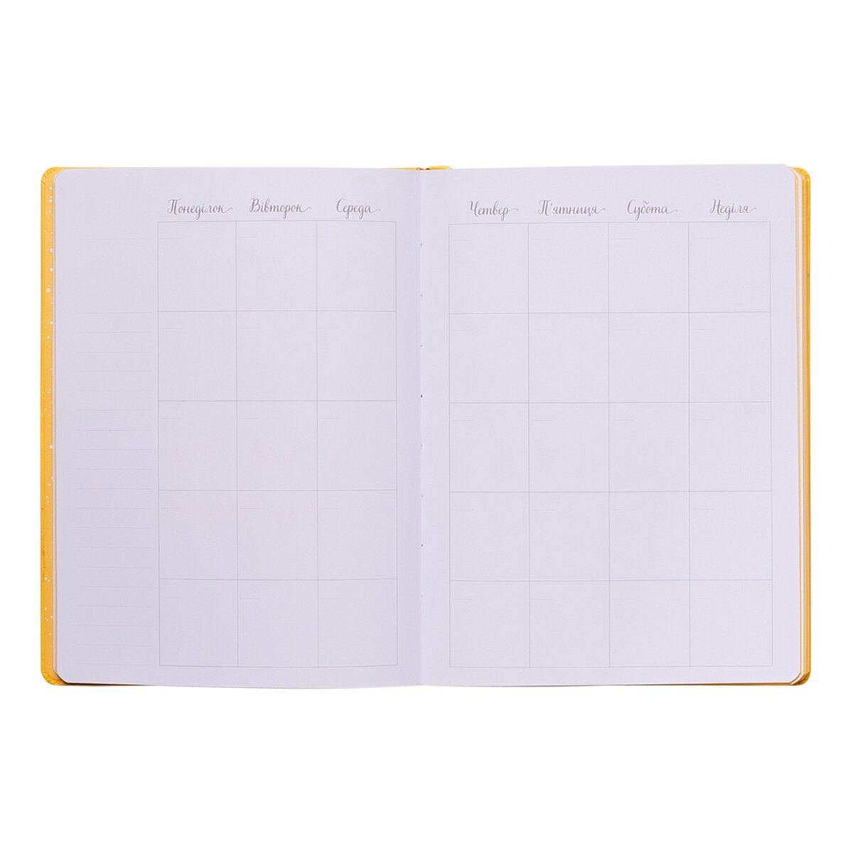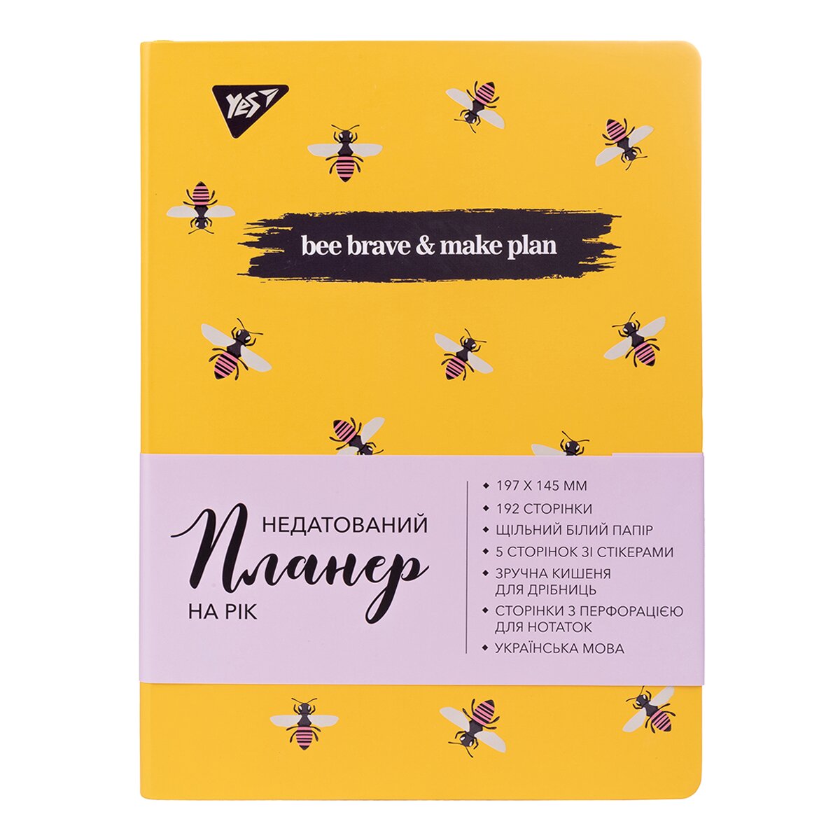 Недатований планувальник YES - практичний помічник на кожен день, зручна і доступна система планування та оцінки результату. У планері є календар на 2 роки, сторінки для планування на тиждень, місяць і рік, сторінка для розкладу, додаткові аркуші для записів та 5 аркушів з кольоровими стікерами для оформлення! Місяці відокремлені мотиваційними сторінками. Додатковий бонус - відривні листи для записів і конверт для стікерів на внутрішній стороні обкладинки. Внутрішній блок - офсет білого кольору, щільністю 100 г / м2, українську мову. М'яка картонна обкладинка з soft touch ефектом, матовою ламінацією, декор - фольга. Планер фіксується в закритому стані гумкою.