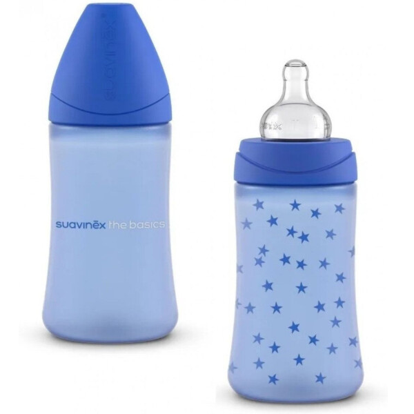 Suavinex Basics - пляшечка для годування малюка від іспанського бренду. Легка, бо виготовлена з поліпропілену. Не містить бісфенол А. Має яскравий дизайн та ергономічну форму. Пляшечка оснащена 3-позиційною соскою, кришечкою для ліпшої стерильності.