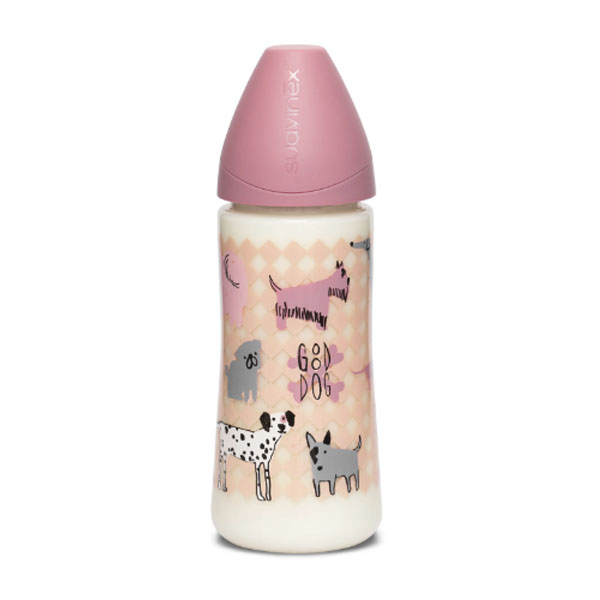 Пляшечка Suavinex Історії цуценят - пляшечка для годування малюка від іспанського бренду. Легка, бо виготовлена з поліпропілену. Не містить бісфенол А. Має яскравий дизайн та ергономічну форму. Пляшечка оснащена круглою соскою (швидкий потік), кришечкою для ліпшої стерильності.