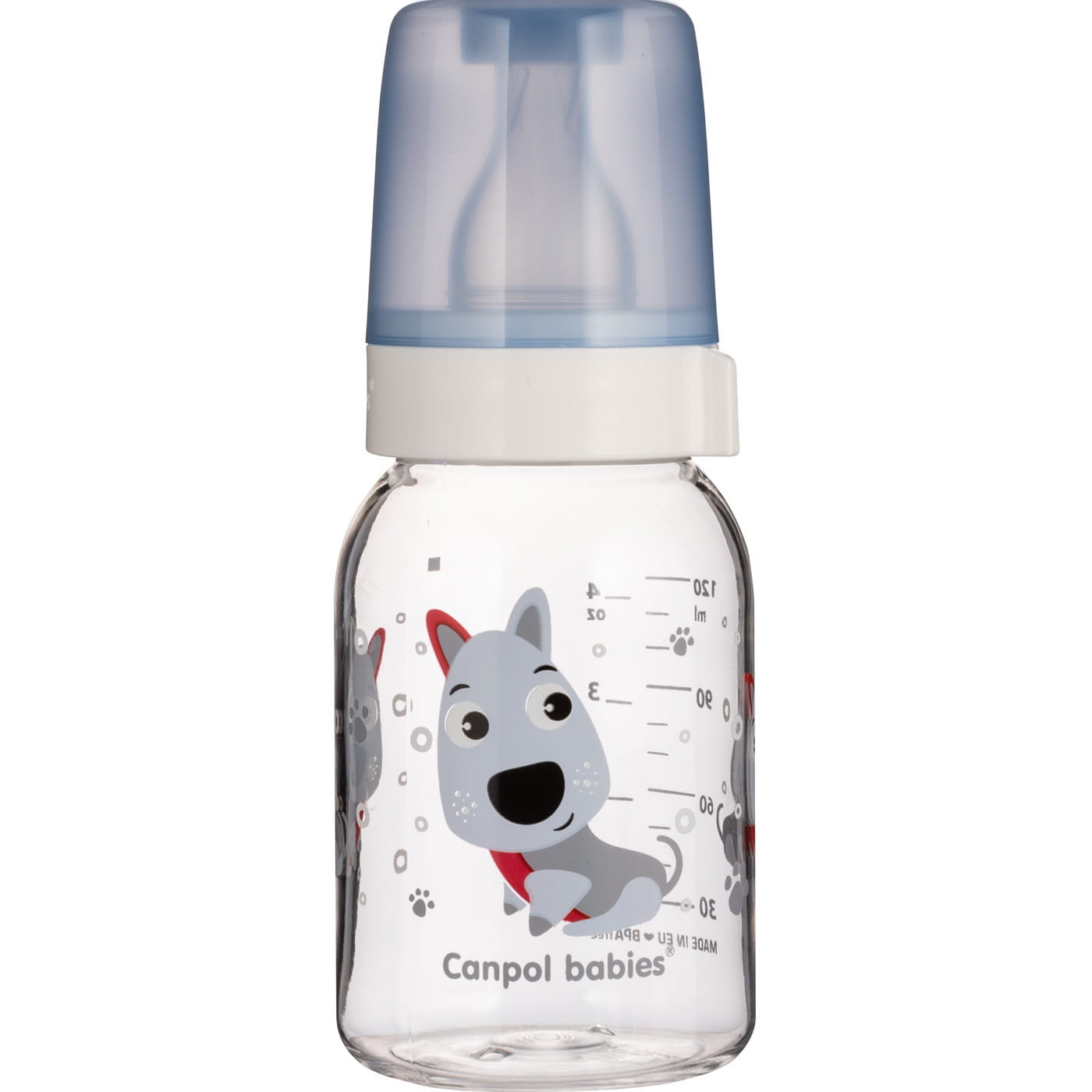 Пляшечка для годування дітей від 3-х місяців забезпечена антиколіковою силіконовою круглою соскою вільного потоку. Об'єм - 120 мл.