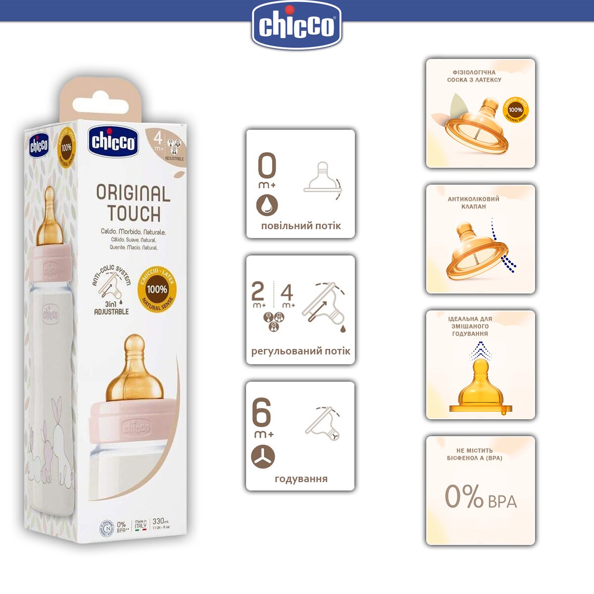 Пляшка для годування Chicco Original Touch з латексною соскою. Соска 0m+ (повільний потік) підходить для немовлят і дітей у перші місяці життя.