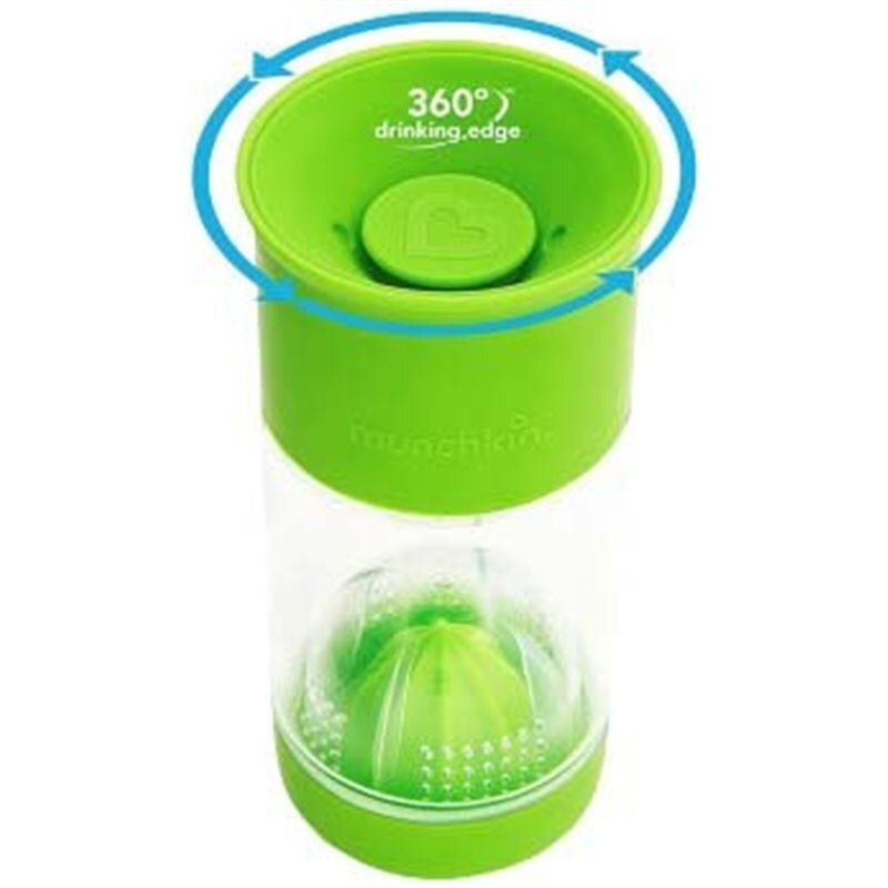 Пляшка для води і напоїв Munchkin Miracle 360 з інфузером для фруктів - ідеальний варіант для вас і вашого малюка, веселий і корисний спосіб надати воді аромат улюблених фруктів. Освіжаюча фруктова вода стане прекрасною альтернативою для дітей, які люблять угамовувати спрагу соком. Кошик для фруктів розташований в нижній частині поїльника, тому солодкий натуральний аромат зберігається не залежно від рівня води.