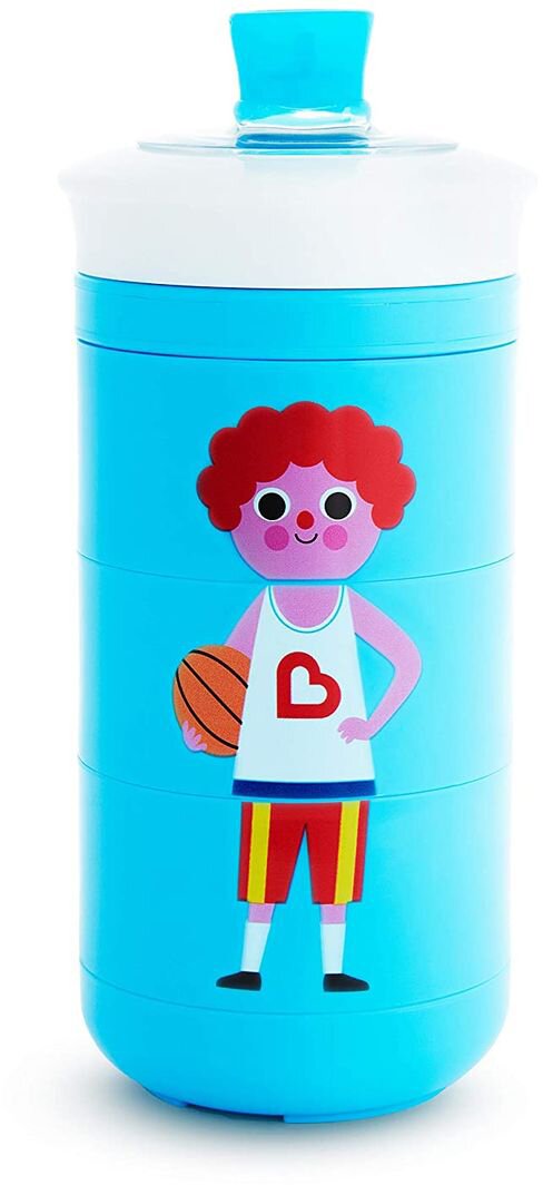 Особливості: 3 рухливі секції з малюнком дають дитині змогу створювати різних персонажів. М'який щільний носик дбайливо контактує з яснами дитини та залишається цілим після покусування. Антипроливний клапан утримує рідину в пляшечці навіть під час падіння. Не містить бісфенолу А (BPA 0%). Пляшку легко розбирати й мити. Об'єм пляшечки: 266 мл.