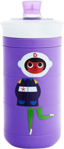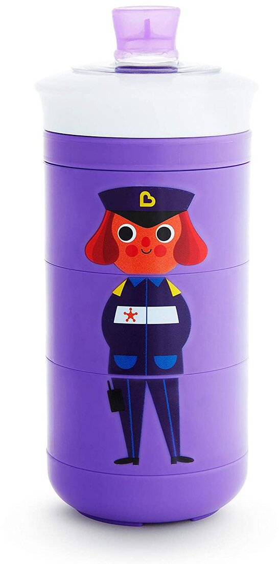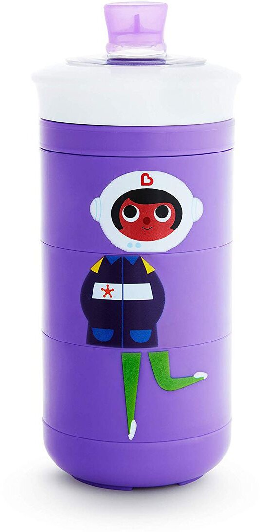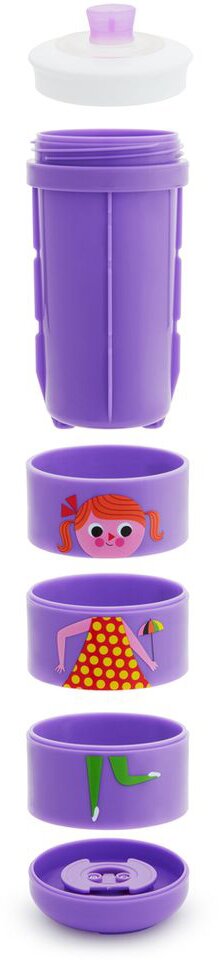 Особливості: 3 рухливі секції з малюнком дають дитині змогу створювати різних персонажів. М'який щільний носик дбайливо контактує з яснами дитини та залишається цілим після покусування. Антипроливний клапан утримує рідину в пляшечці навіть під час падіння. Не містить бісфенолу А (BPA 0%). Пляшку легко розбирати й мити. Об'єм пляшечки: 266 мл.